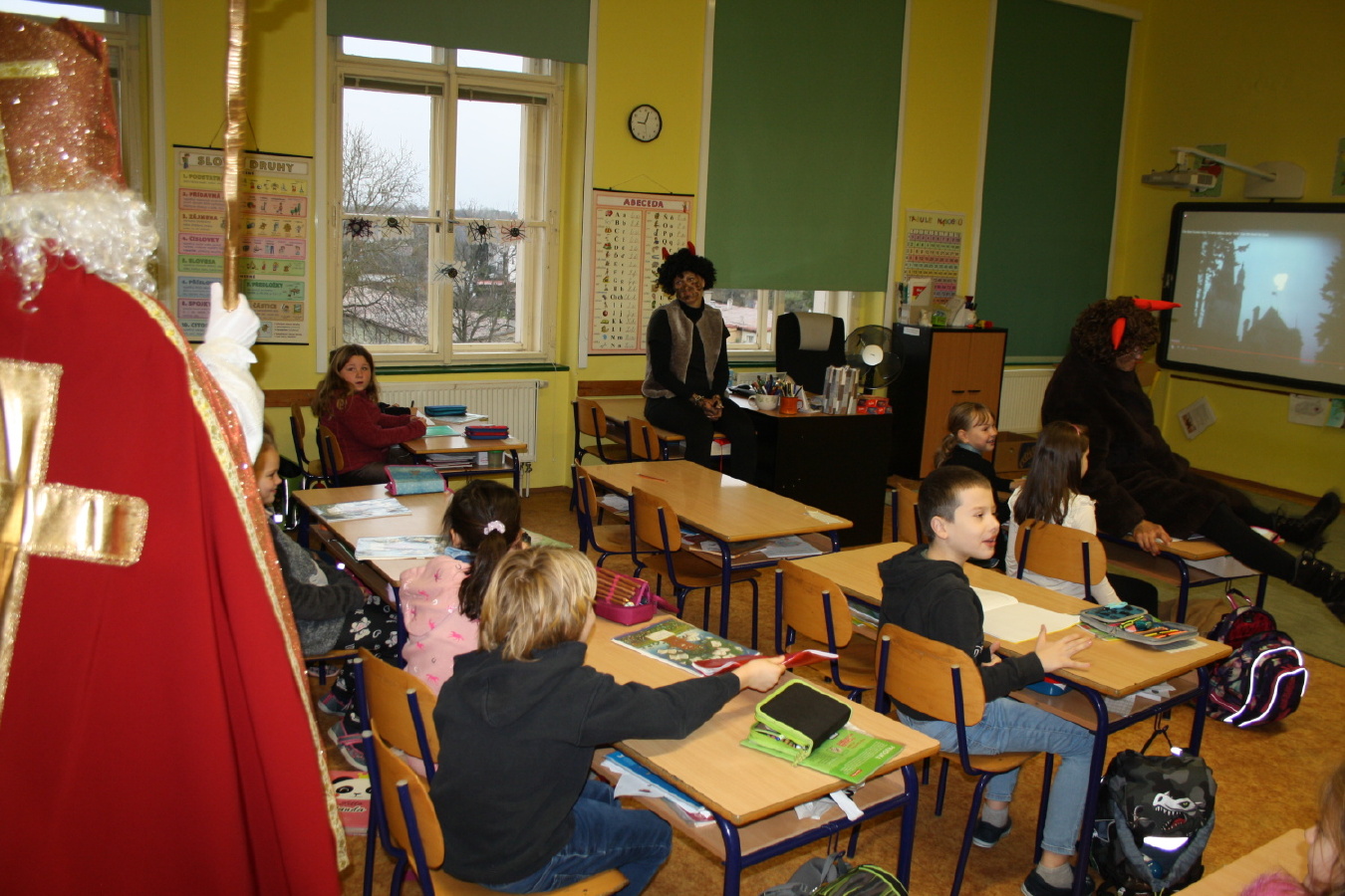 V pondělí 5. 12. bylo ve škole první hodiny veselo - mladší školáky totiž navštívila čertovská chasa s Mikuláši a andělkami. Mikuláši byli vzorně připraveni, v knize hříchů měli zapsány všechni hříšníky a čertice si na ně pořádně posvítily. Děti měly pro čertí návštěvu připravené písničky a básničky a tak bylo ve třídách veselo.
