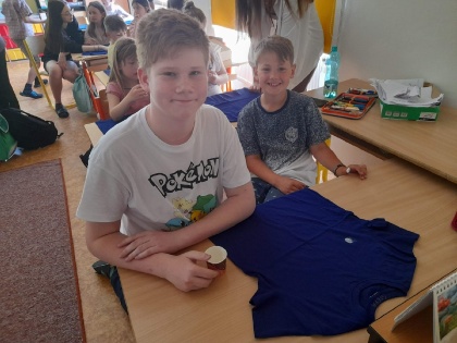 Po cestě zpět jsme se už začali těšit na pátek, kdy mezi nás přišli naši patroni z IX.C, abychom natrénovali společné vystoupení na plánovanou Akademii. Také jsme si ozdobili trička, ve kterých budou naši druháčci vystupovat. Na památku spolupráce nám trička zdobí otisky, na přední straně otisky palců ve tvaru srdíček a na zadní straně celých dlaní. Moc jsme si společný den užili a těšíme se na další. Bc. Lucie Kubínová