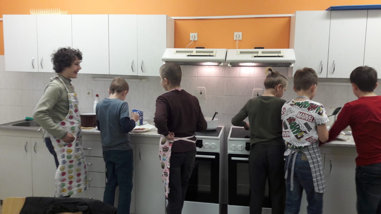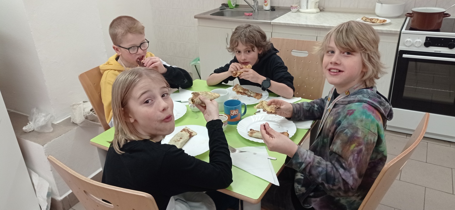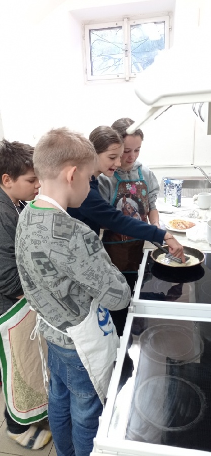 Zkusili jste někdy usmažit téměř 80 palačinek? Je k tomu určitě potřeba sehraný tým. A tím rozhodně páťáci z áčka jsou! Připravili palačinky s různými druhy marmelád, s nutelou, se šlehačkou, ale překvapili i palačinkami se speciální masovou náplní nebo se sýrem. Jejich souhra ale nepolevila ani při finálním úklidu. Nebojím se říci, že páťáci jsou rozhodně při práci v kuchyni rovnocenným partnerem vyšším ročníkům. Mgr. Pavla Devátá