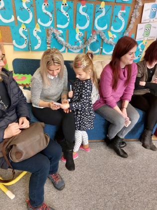 V pátek 9. 12. děti přivítaly ve třídě své rodiče. Každý, kdo se na svého školáka přišel podívat, viděl, jak velký pokrok jsme od září společně udělali. Maminkám a tatínkům jsme přečetli písmenka z tabule a článek v čítance, zatancovali šamanský tanec, zahráli si hru Horolezec, napsali slova na tabulku a spočítali příklady ve hře Stonožka. Na konci hodiny jsme zapojili i rodiče, aby dětem zkontrolovali ,,vločkové,, příklady.