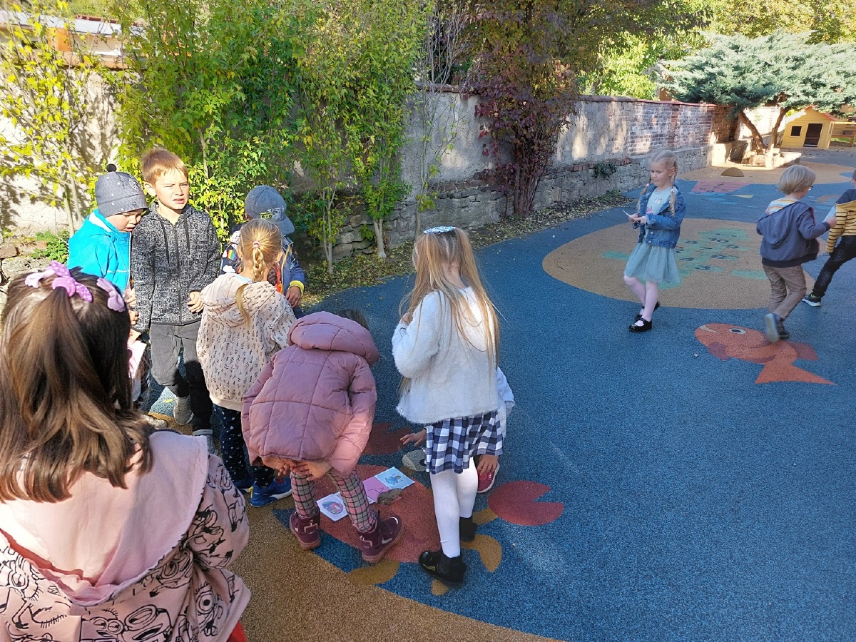 Krásné podzimní počasí využíváme k učení venku, nejinak tomu je i v I. D. Děti trénovaly písmenka, která již znají, přiřazovaly obrázky, cvičily. Zahrály si i na detektivy, hledaly slova a poté zapisovaly na mazací tabulku. Pracovaly ve skupinách a moc hezky si pomáhaly. Největší zábava pro ně bylo psát písmena a slova křídou na zem. Podle slov paní učtelky byly děti venku moc spokojené a zpět do školy na další výuku se jim vůbec nechtělo. .