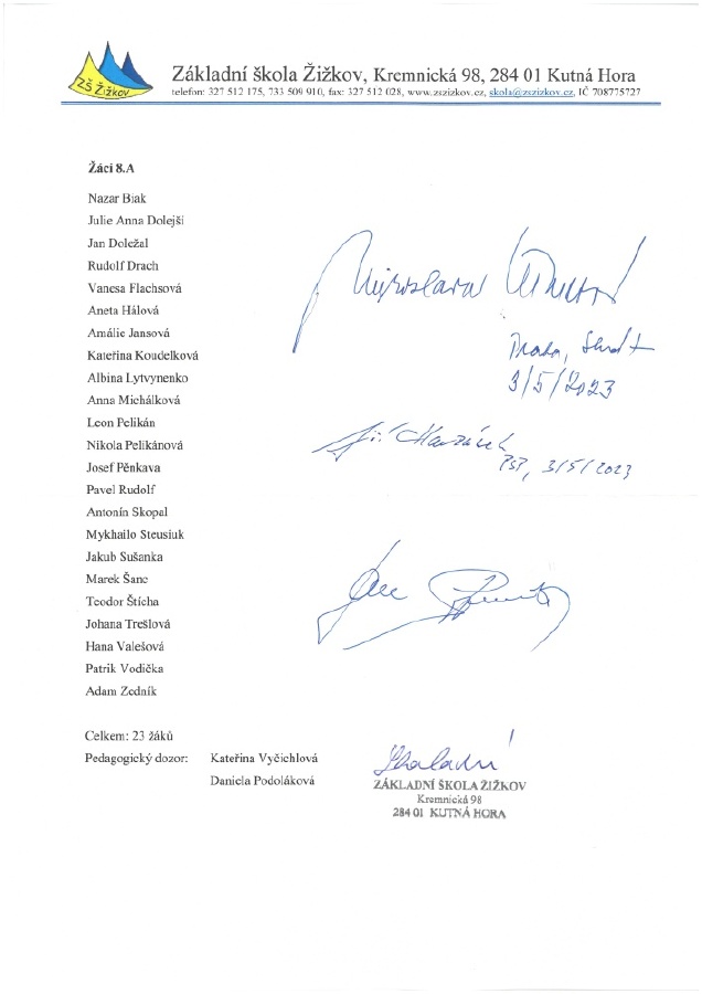 Ve středu 3. května se osmáci z áčka podívali do obu komor Parlamentu ČR. Nejprve si prohlédli Senát PČR, kde byli přivítáni paní senátorkou Miroslavou Němcovou. Následovala prohlídka Poslanecké sněmovny PČR, kde proběhlo přivítání v pracovně Jana Skopečka, místopředsedy Poslanecké sněmovny PČR a setkání a diskuze s poslancem Jiřím Havránkem. Žáci se tak velice podrobně seznámili nejen s prostorami obou komor Parlamentu ČR, ale i s fungováním těchto institucí a s tím, co je náplní práce poslanců a senátorů. Velké poděkování patří Jakubu Skyvovi, který nám exkurzi zajistil. Mgr. Kateřina Vyčichlová