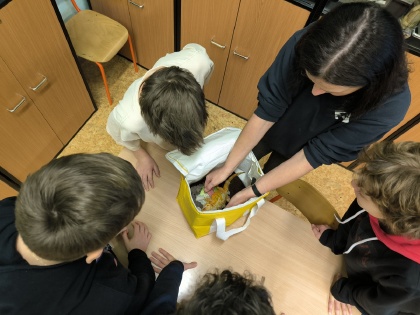V pátek 12.1. se žáci sedmých ročníků seznámili se zemním ještěrem agamou vousatou druhu silkback, která má kůži bez šupin. Mohli tak vidět odlupování kůže po částech, dále pak krmení tohoto ještěra živým hmyzem, pohyb očních víček, pozorovat velikost, tvar těla a projevy ještěra. Chtěli bychom poděkovat Eliáši Vranému z třídy VII. B, který přinesl agamu a vysvětlil nám pravidla jejího chovu. Mgr. Iva Klaudová, Mgr. Jana Kořínková a sedmáci