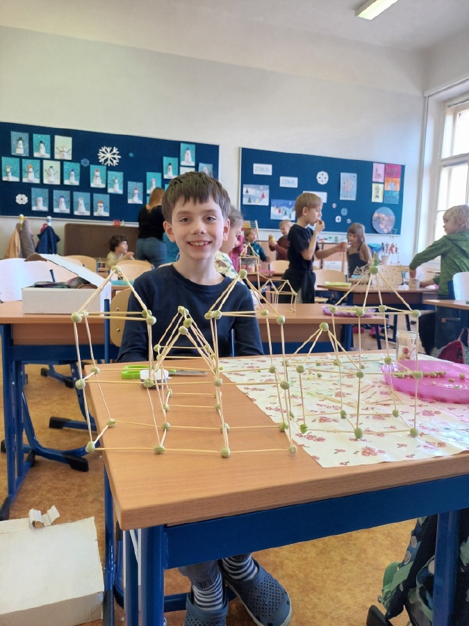 V úterý 13. 2. se druháčci z béčka pustili do tvoření. Ke stavbám využili originální stavebnici - hrášek a párátka! Někteří se stali architekty honosných vysokých budov o několika patrech s věžičkami, další vytvořili ježka a jiní napsali jméno paní učitelky ve 3D... Zjistili, co zajišťuje stabilitu staveb, když se jim jedna komplikovaná budova, která postrádala pravé úhly, do rána zřítila. Pobavili se, spolupracovali a naučili se hodně nového. Vlastnoručně vyrobená stavebnice je nejlepší. Mgr. Markéta Štifterová