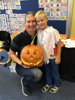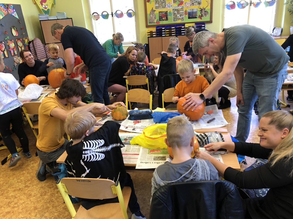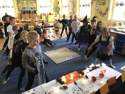 Ve středu 26.10. si děti v I.C užily Halloweenský den. Projekt Rodiče ve škole začal rejem strašidel a různých masek, děti hledaly po třídě symboly Halloweenu, poslechly si legendu o Jackovi - Jack-o'-lantern. Hrály soutěživé hry s jablkem a plnily úkoly v šesti centrech, kde na ně čekaly různě obtížné úlohy s halloweenskou tématikou. Skládaly slova z písmenek, hledaly cestu v bludišti, po třídě létali duchové a žáci přepisovali jejich jména velkými tiskacími písmeny a počítali dýně. Pomoci nám přišlo 11 rodičů a společně jsme dlabali dýně. Maminky napekly haloweenské perníčky, kynuté dýně obalené ve skořicovém cukru a linecká strašidla a přinesly spoustu lízátek a čokolád. Celá akce končila halloweenskou párty. Děti si den užily, všem rodičům moc děkujeme.
