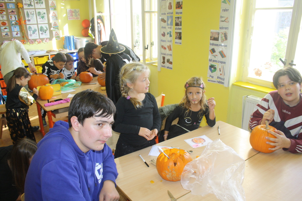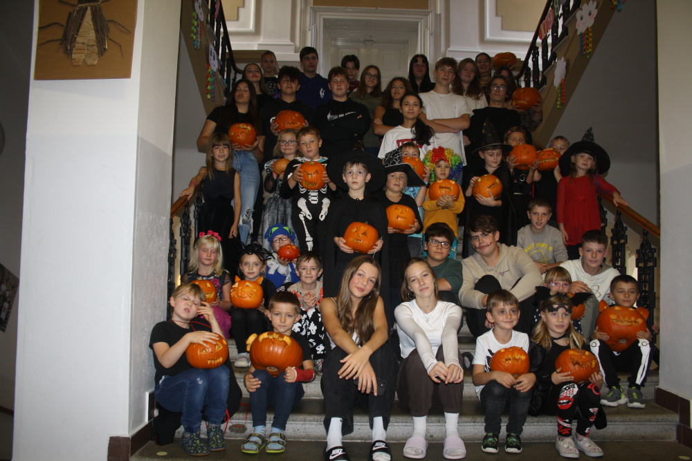 Ve sředu 25.10. se sešli prvňáčci a osmáci z béčka a společným silami se dali do dlabání dýní. Prvňáčci byli za pomoc osmáků moc vděční, protože pro ně je to činnost opravdu náročná a sami by to nezvládli. Vznikly krásné strašidelné dýně, na které byli jejich autoři právem hrdí a které si děti pro radost odnesly domů.
