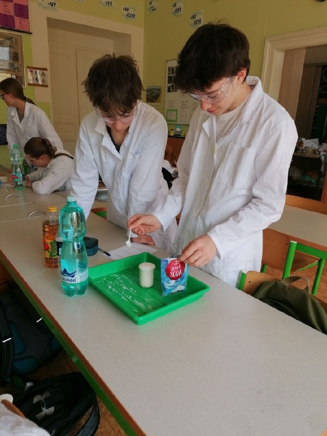 Osmáci z áčka a béčka si opět trochu zalaborovali. Tentokrát připravovali oxid uhličitý reakcí jedlé sody s octem, dokázali jeho rozpínavost nafouknutím balonku, rozpohybovali jím rozinky v kádince, probudili sopku a vytvořili hada z popele. Plamenovou zkouškou dokázali charakteristické zbarvení iontů přítomných v roztocích. Všem skupinám se práce dařila a už se těší na další experimentování. Mgr. Hana Ratajíková