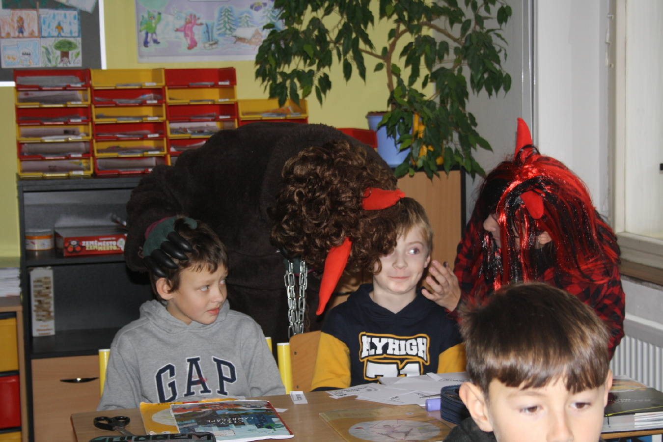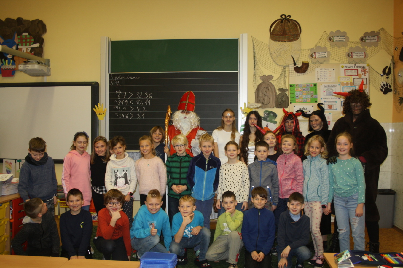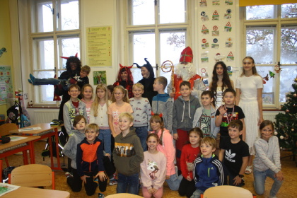 V úterý 5. 12. bylo na 1. stupni rušno a veselo - konala se totiž tradiční Mikulášská pochůzka. Naše chasa čertovská, mikulášská a andělská se rozdělila na čtyři party a vyrazila mezi děti. Všichni Mikulášové měli Knihu hříchů a žádný lupínek jejich pozornému oku neunikl. A pak přišli na řadu čerti, kteří se největším zlobilům s chutí a elánem věnovali. Velké poděkování patří kolegyním asistentkám a deváťákům, kteří obchůzku pro nejmenší školáky připravili.
