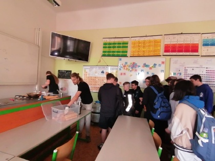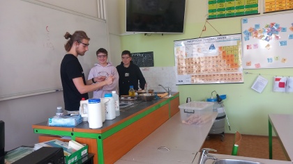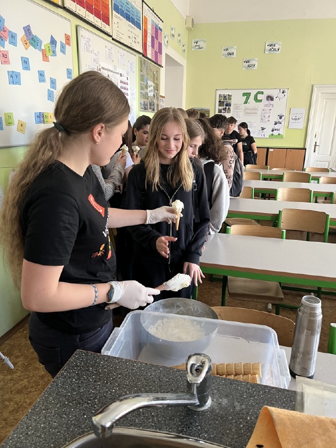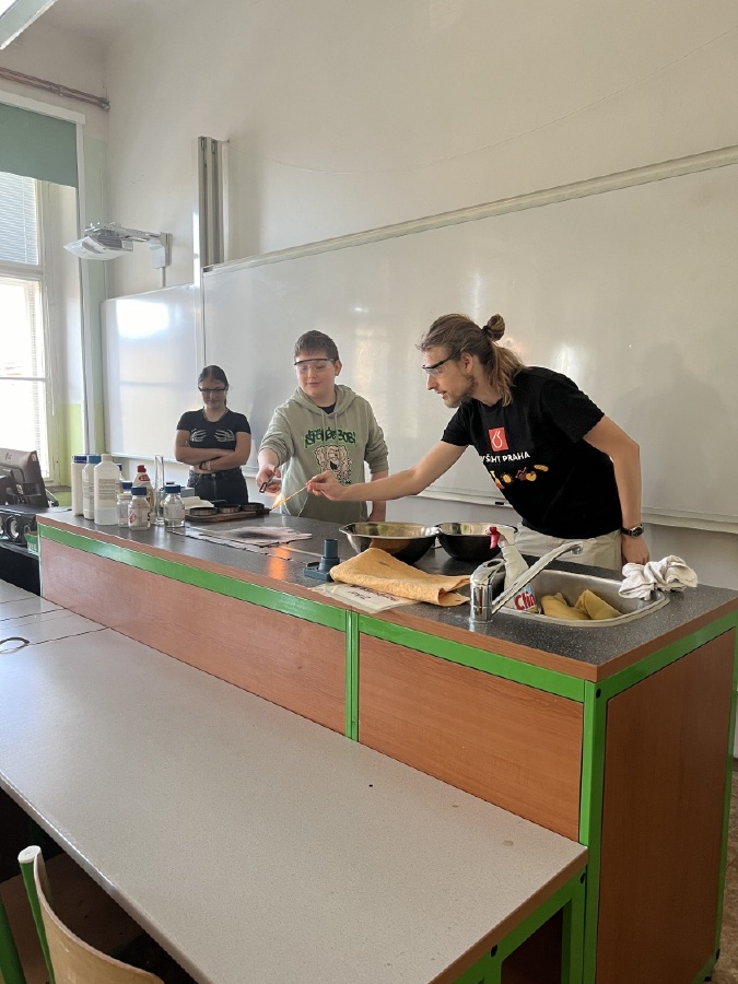 V pátek 12.dubna proběhla Hodina moderní chemie pro osmáky. Přivítali jsme studenty z Vysoké školy chemicko-technologické z Prahy, kteří nám předvedli vyučovací hodinu plnou fascinujících experimentů. Osmáci viděli nejen barevné a poutavé pokusy, ale seznámili se také s použitím kapalného dusíku v chemii. Na závěr jsme zhlédli gastronomický experiment - výrobu zmrzliny pomocí dusíku. Celá hodina pro nás byla poučná i zábavná a věříme, že přispěla k rozvoji zájmu o chemii na naší škole a inspirovala k dalšímu bádání a objevování tajů vědy. Ing. Šárka Nováková