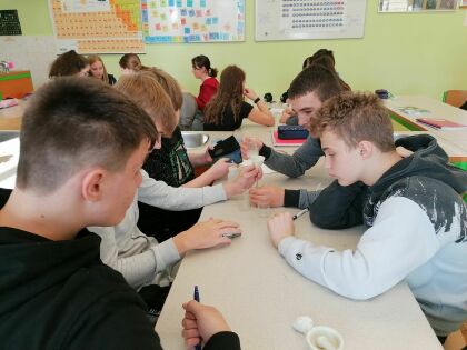 Osmáci z áčka a béčka si v hodinách chemie vyzkoušeli základní separační metody pro oddělování složek ze směsí. Z listů extrahovali zelené a žluté barvivo na základě rozpustnosti v různých rozpouštědlech. Suspenzi křídy a vody oddělovali filtrací s použitím různých filtračních materiálů. Pracovali ve skupinách, sestavovali jednotlivé aparatury, zapisovali protokol, nacvičili základní technologické postupy a práci s laboratorním náčiním. Všem skupinám se práce podařila na jedničku. Mgr. Hana Ratajíková, Ing. Šárka Nováková