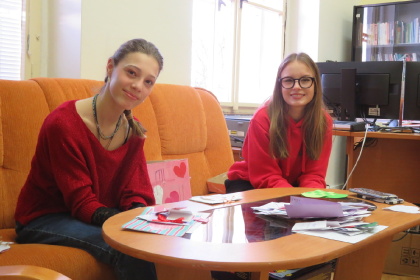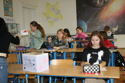 Ve středu 14. 2. jsme si užili Valentýnskou poštu. Slečny z devítek přinesly do ředitelny Valentýnské poštovní krabice, kam jsme v předcházejících dnech mohli vhazovat přáníčka pro všechny, na kterých nám záleží a komu jsme chtěli něco hezkého popřát, vzkázat. Pečlivě skoro dvě hodiny třídily a přebíraly psaníčka a pak se vypravily po škole valentýnské pozdravy roznést. MOC nás mrzí, že i letos se zřejmě našli tací, kteří neposlali vzkaz milý, bohužel tomu nedokážeme zabránit. Pevně ale věříme, že drtivá většina vzkazů (a že jich bylo) své adresáty potěšila - my jsme také dostali a měli jsme velkou radost! Velké poděkování posíláme deváťačkám, které této akci věnovaly skoro celé dopoledne a pořídily krásnou fotodokumentaci. Tak zase za rok...
