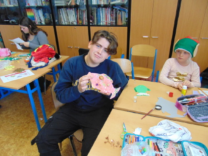 Ve středu 6.12. se prvňáčci z béčka se svými patrony z osmičky přenesli do kouzelného světa Vánoc, vyráběli totiž společně z papíru vánoční kapříky. Stříhali, kreslili, lepili, zdobili třpytkami a společné strávené chvíle si užili. Mgr. Kateřina Vyčichlová