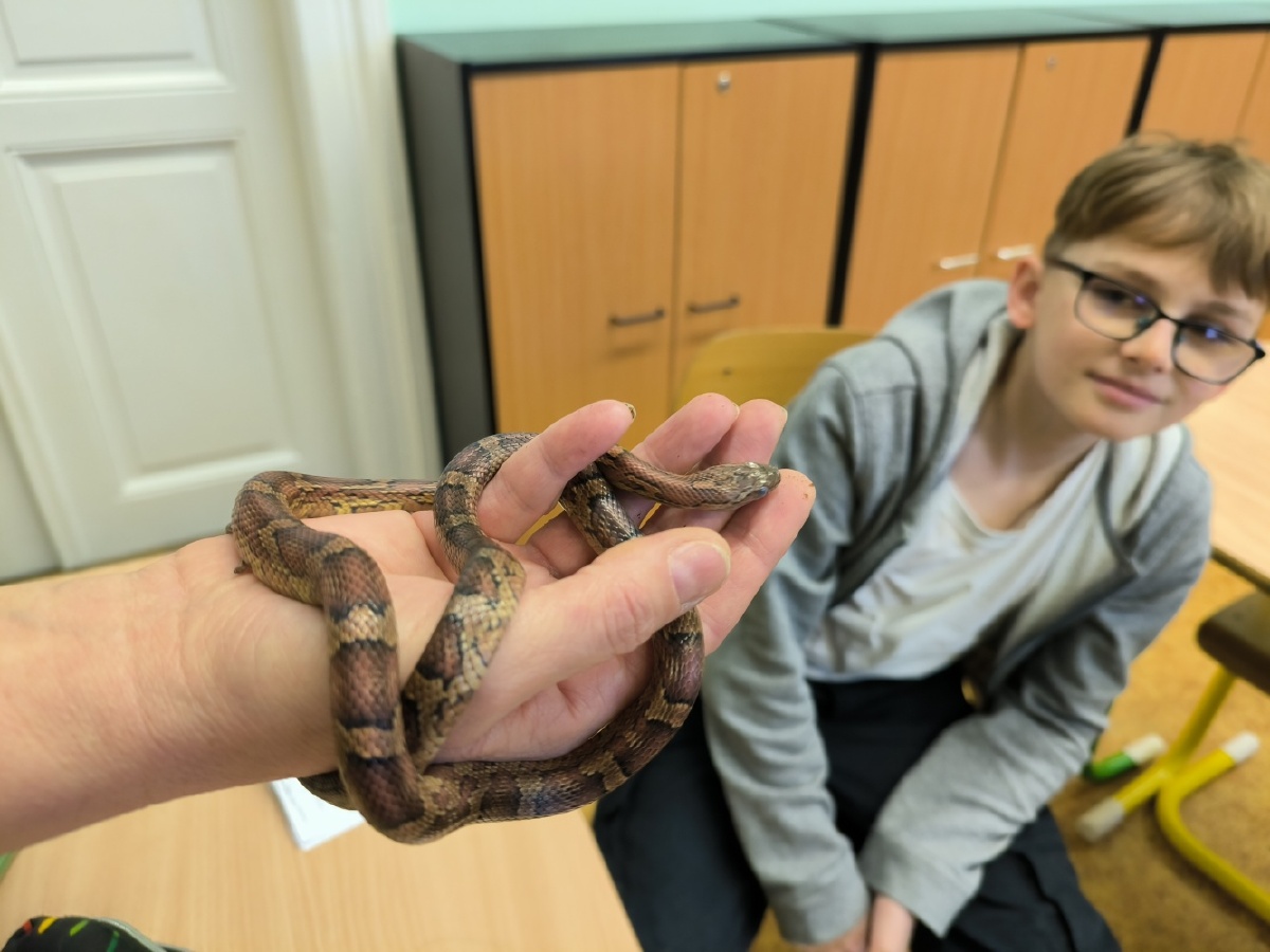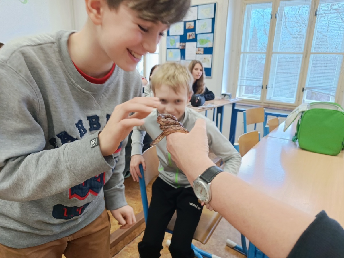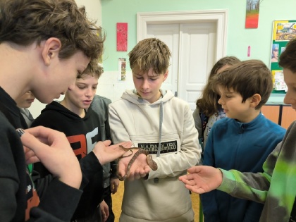 V pátek 26.1. se sedmáci seznámili s živým exemplářem užovkou červenou, kterou nám poskytl ze své sbírky Eliáš Vraný ze VII. B. Jedná se o neútočného hada, u kterého jsme nejprve pozorovali vnější stavbu těla, viděli jsme zakalené oči užovky, která byla zrovna před svlékáním kůže. Dále jsme se seznámili s její vhodnou potravou a jak by mělo vypadat terárium. Nejprve byly určité obavy si na hada sáhnout a zjistit, zda kůže je vlhká či suchá, později jsme si dodali kuráž a hada si doslova zamilovali. Ještě jednou velké díky Eliášovi. Mgr. Iva Klaudová, Mgr. Jana Kořínková a sedmáci