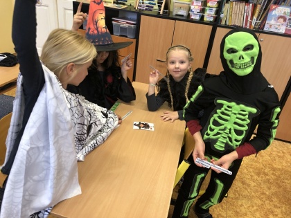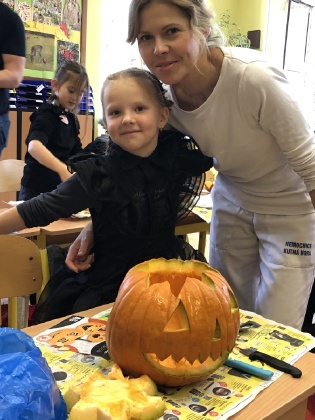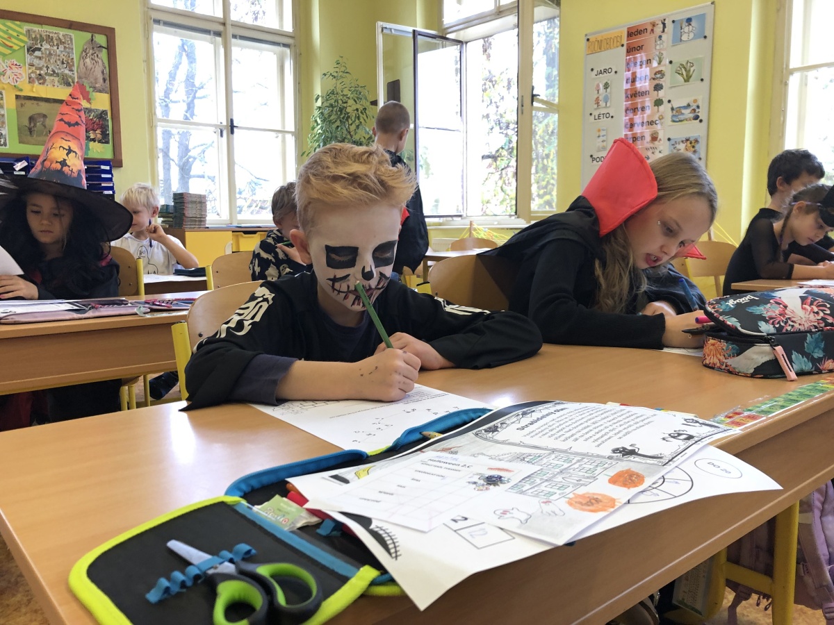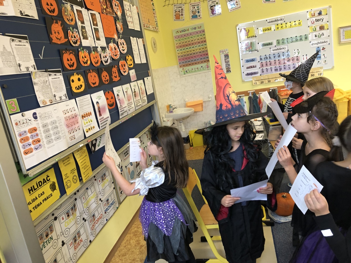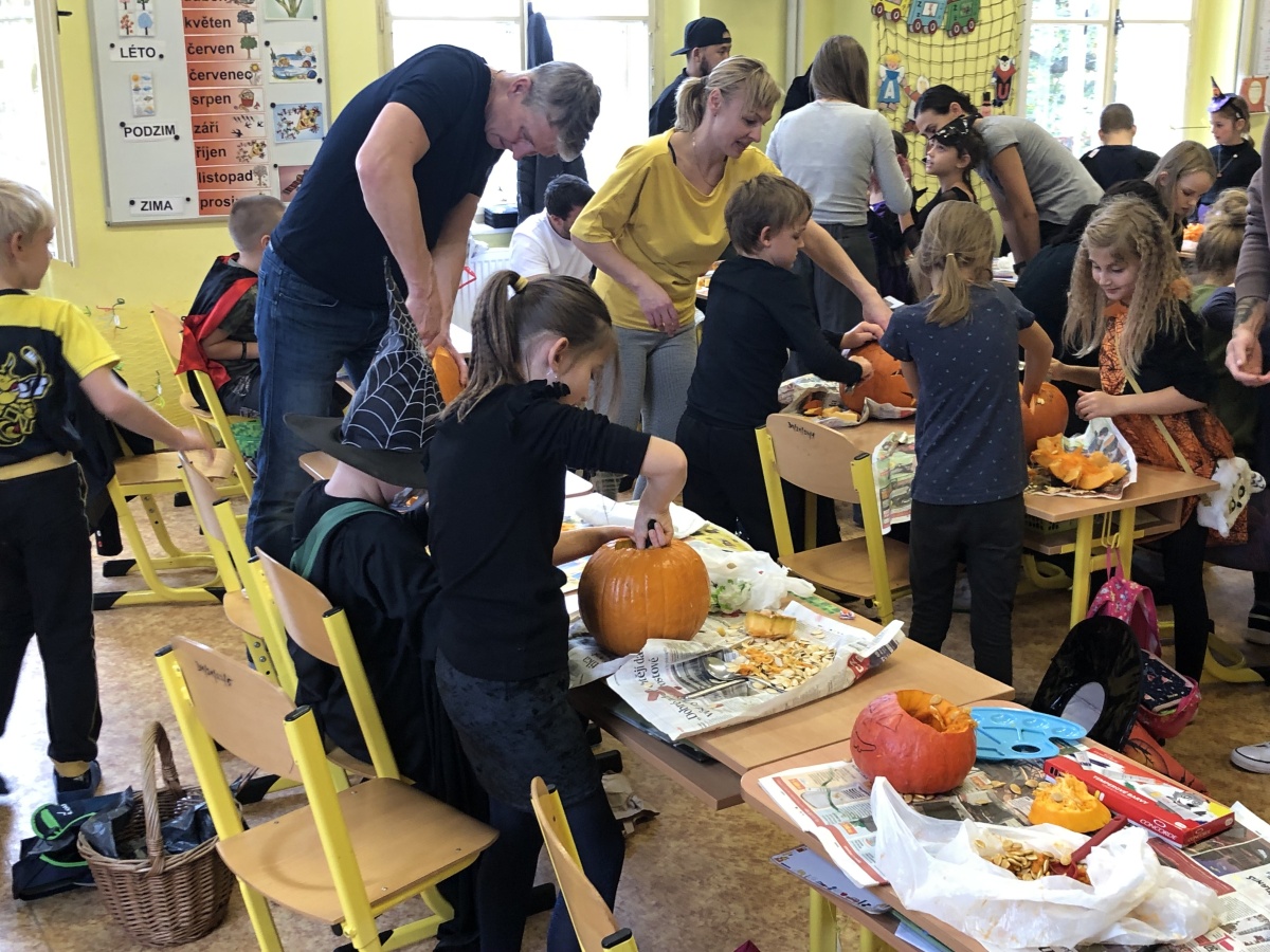 Ve čtvrtek 31. října se žáci II.C přidali k Žižkovskému halloweenu. Projektový den Rodiče do škol začal rejem upírů, kostlivců, čarodějnic a různých strašidel. Žáci hledali po třídě symboly halloweenu, skládali podle abecedy jména čarodějnic, hráli soutěživé hry s dýní, plnili úkoly v šesti centrech, kde na ně čekaly různě obtížné úkoly s halloweenskou tématikou. Řešili sčítací pyramidy, četli s porozuměním strašidelný dům, luštili šifru, plnili úkoly v hadech, spojovali netopýra a lepili dýni. Pátou a šestou hodinu nám přišlo na pomoc 16 rodičů a prarodičů a společně jsme dlabali dýně. Maminky napekly krvavé pečené prsty, duchy, lebky a pavoučí sítě, kynuté dýně ve skořicovém cukru a strašidla si moc pochutnávala mňam, mńam to bylo dobré. Celá akce končila halloweenskou párty. Děti si den užily, všem rodičům moc děkujeme. Mgr. Radka Krejdlová
