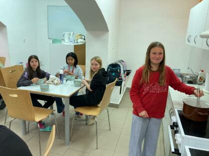 Páťáci z béčka trénovali v českém jazyce popis pracovního postupu, vybrali si přípravu pudinku. A aby nezůstalo jen u slov, na pátek 15. listopadu jim jejich paní učitelka zarezervovala školní kuchyň a pustili se podle svých slohových prací do vaření. Pudink i pracovní postupy se povedly na jedničku, děti byly nadšené! Mgr. Eva Votrubová