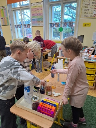 Třída IV. A se s nadšením pustila do příprav na soutěž Pohár vědy a objevovala kouzlo vědeckých pokusů. Při výrobě lávové lampy žáci poznali rozdílnou hustotu oleje a vody, rozpustná tableta vytvořila fascinující bubliny. V pokusu s mléčnou pěnou sledovali, jak obarvená voda dokáže proniknout vrstvou pěny nastříkané na hladinu kádinky až na dno. Odvar z červeného zelí jim ukázal barevné proměny při použití sody, octa a co se stane při jejich smíchání. Děti byly ukázněné, nadšené a už se těší na leden, kdy se jim otevře první kolo soutěže. Ing. Šárka Nováková, Mgr. Jana Němečková Růžičková