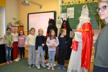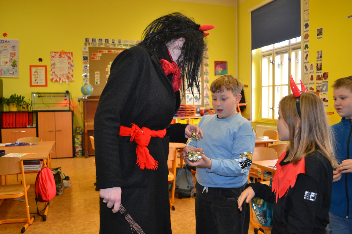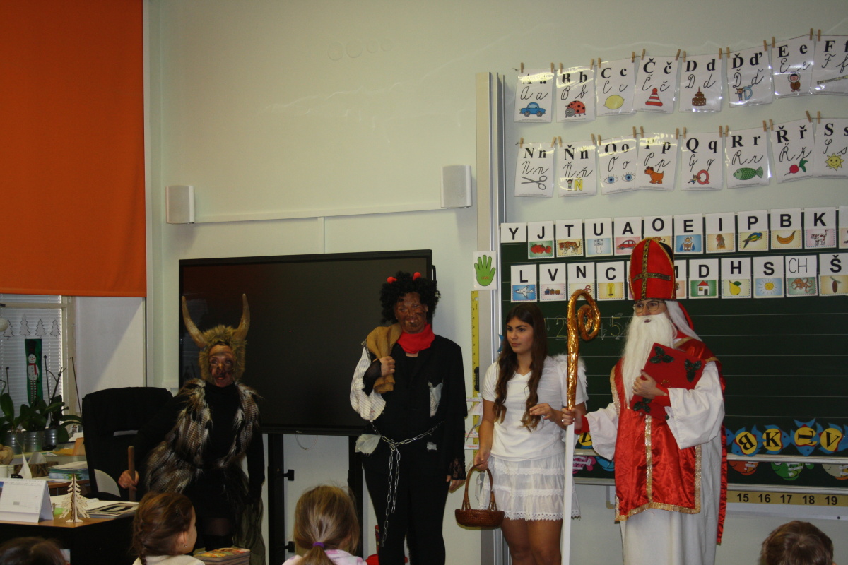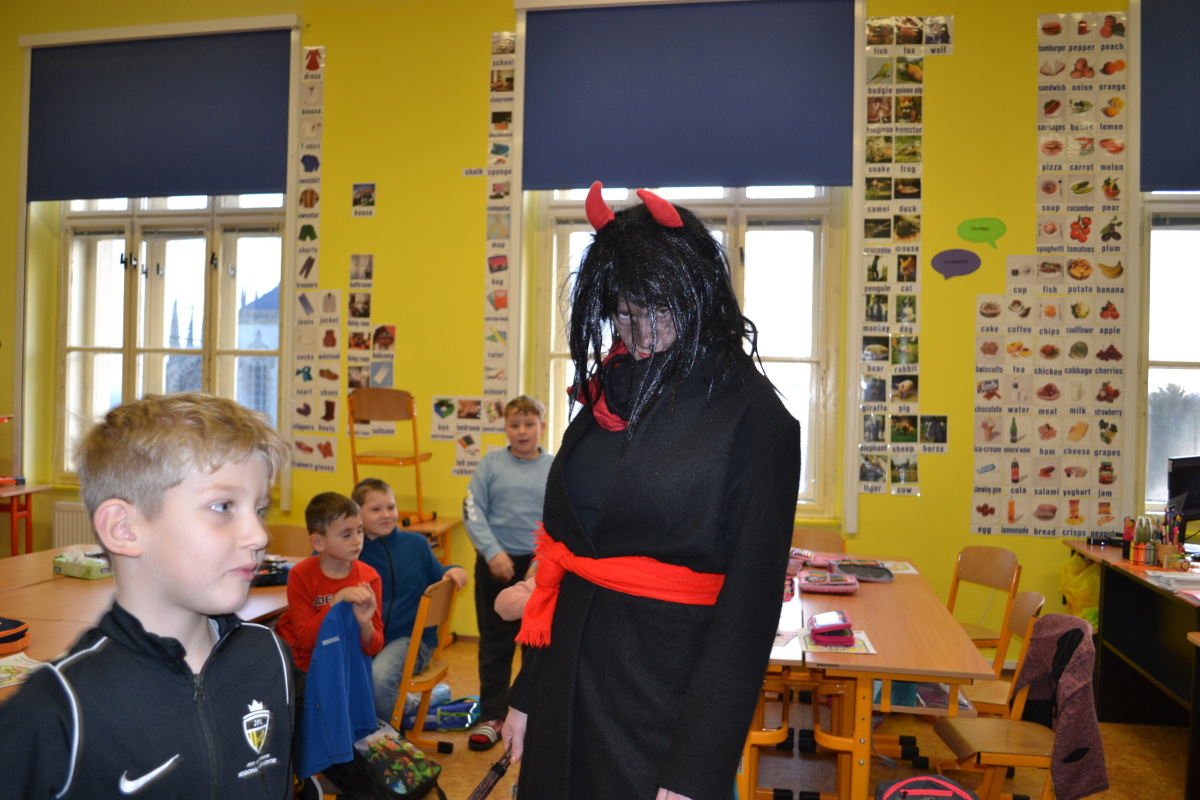 Ve čtvrtek 5. prosince byla plná škola čertů - a nejenom čertů, přišlo i pět Mikulášů a andělíčci...Obešli všechny třídy na 1. stupni, Mikuláš měl vždy hlavní slovo, čertice si vzaly na starost malé hříšníky, andělíčci rozdali dětem sladkosti...