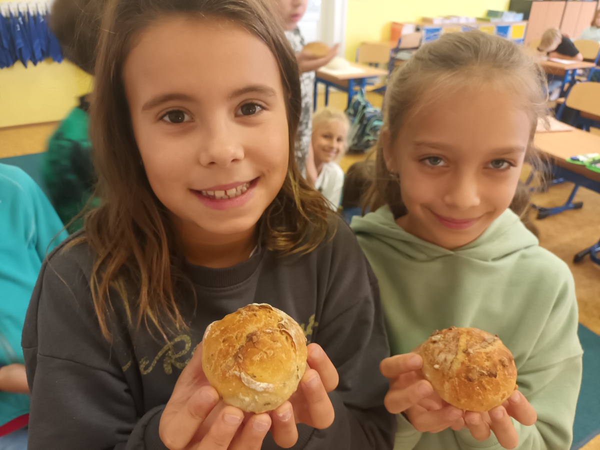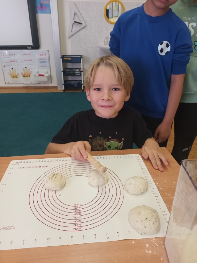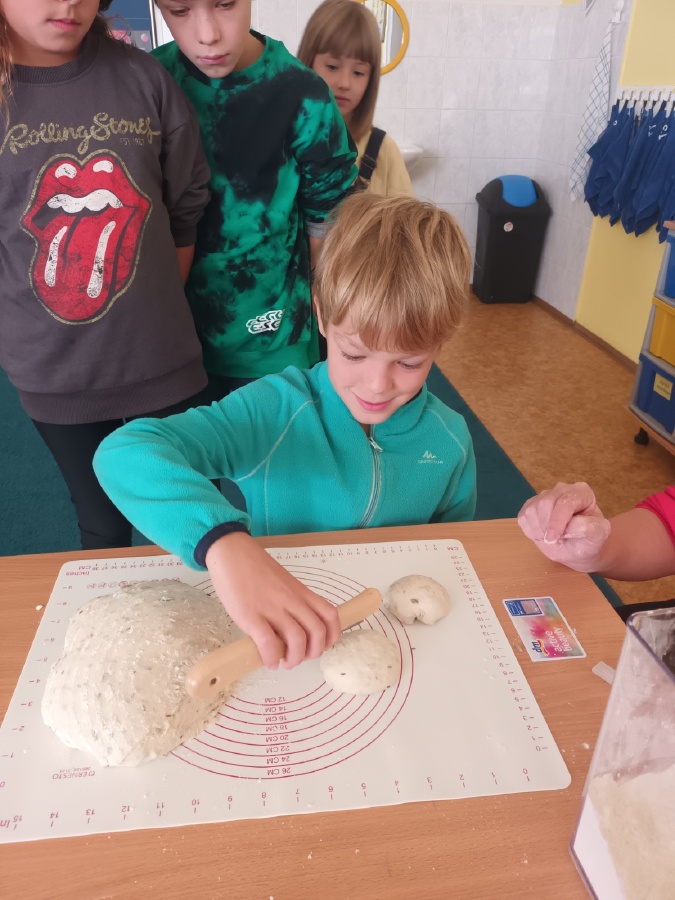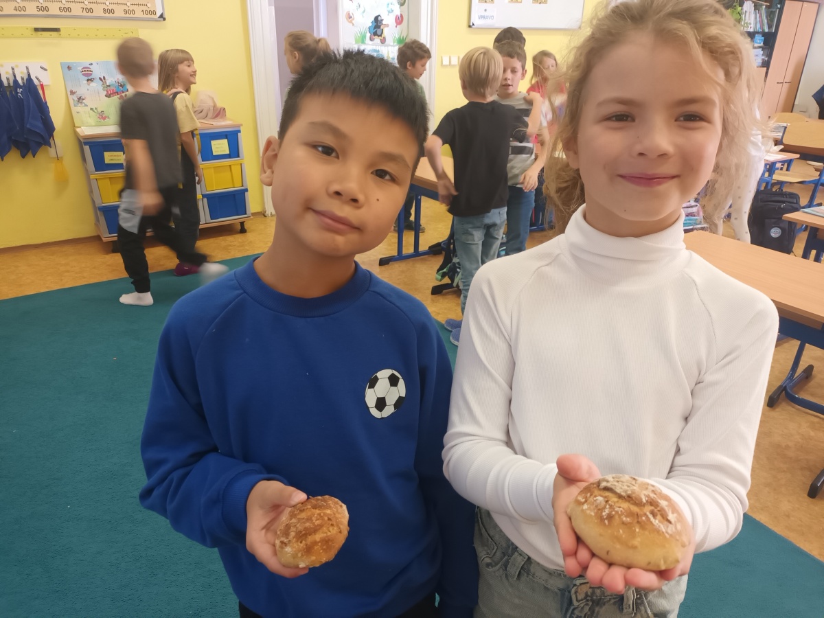 V pondělí 7. října měly děti ve III. B napilno. V předmětu člověk a jeho svět pracovaly s kapitolou Příběh chleba a vyprávěly si, jak se v minulosti obilí sklízelo, mlelo a následně použilo do těsta. Společně s paní učitelkou prozkoumaly rozdíl mezi kypřícím práškem, droždím a kváskem, vyjmenovaly si, co se do těsta na chleba dává. A nakonec si každý z kváskového těsta upekl svůj maličký bochníček. Spokojenost byla veliká! Mgr. Markéta Štifterová