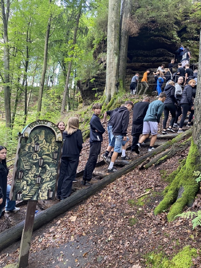 Od pondělí 9. do pátku 13. září se třídy IX. A a IX. B společně vypravily na outdoorový pobyt do České Kamenice. Penzion Kamzík jim poskytl komfortní ubytování a dobrou stravu. Společnost Ceres Bohemia s.r.o. na místě zajišťovala pro žáky odpolední a večerní animační program. Lektoři společnosti zaměřili nabízené aktivity mírně na sport, obecné znalosti, schopnost postřehu, soutěživost, částečnou spolupráci a zábavu. V dopoledních hodinách studenti se svými učitelkami v rámci svých tříd prohloubili své sociální a komunikativní kompetence a udělali kus práce v debatách při výběru ikonického kousku oblečení či doplňku, kterým v průběhu posledního ročníku základní školy jednotně zviditelní svou pospolitost, originalitu a nápaditost.