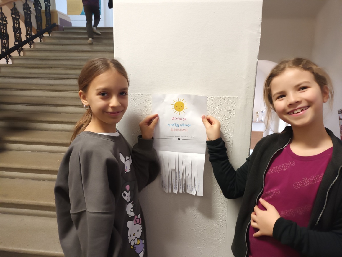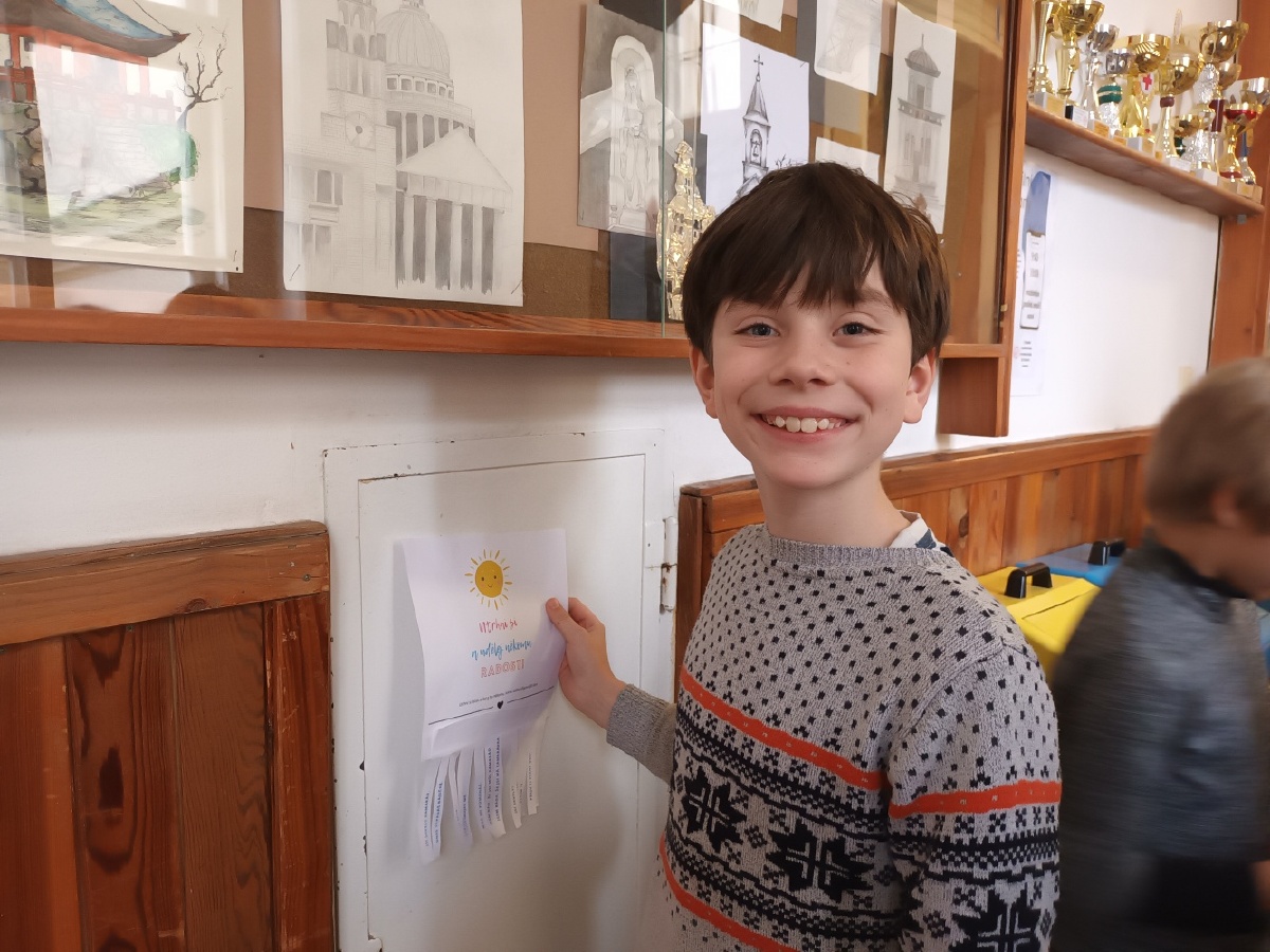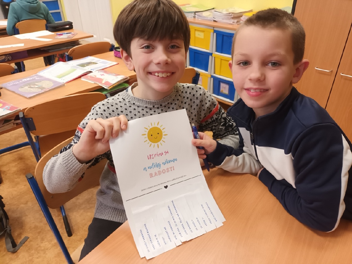 V naší škole máme speciální adventní kalendář. Na každý den připadá nějaký zajímavý a zábavný úkol. Na dnešní den, 2. prosince, připadl krásný úkol, udělat někomu radost nebo učinit dobrý skutek. Žáci ze IV. B se do tohoto zadání pustili s nadšením. V hodině výtvarné výchovy vytvořili originální papíry s odtrhávacími lístečky. Na nich byly milé a povzbudivé vzkazy jako například: „Jsi skvělý kamarád.“ „Moc mi pomáháš.“ nebo „Přeju ti pěkný den!“ Hotové listy žáci rozmístili po celé škole, aby si každý, kdo bude chtít potěšit druhého, mohl jeden lísteček utrhnout a předat dál. A zájem byl velký – už během téhož odpoledne byly některé papíry úplně bez lístečků. Věříme, že se díky nim rozšířilo po škole mnoho úsměvů a příjemných okamžiků. A čtvrťáci? Ti si své přání udělat ostatním radost rozhodně splnili. Mgr. Markéta Štifterová
