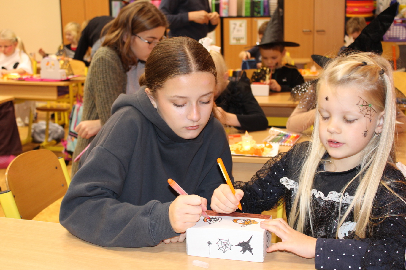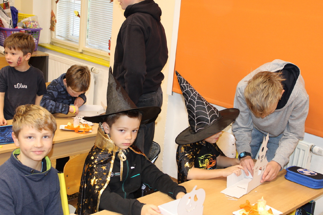 V pátek 31. října ožila naše škola v duchu Halloweenu. Prvňáčci a osmáci se setkali, aby si užili čas společného tvoření, her a strašidelné zábavy. Prvňáčci přivítali své starší kamarády ve skvěle vyzdobené třídě, kde nechyběly pavučiny, dýně a další strašidelné dekorace. Děti měly připravené úžasné kostýmy, které vykouzlily tu pravou halloweenskou atmosféru. Osmáci výzdobu jejich třídy skvěle doplnili velkou vydlabanou dýní se světýlky. Společně strávili první vyučovací hodinu, během které si povídali, vyráběli menší dekorace a hráli zábavné hry, byly to opravdu chvíle pohody a radosti. Poté se osmáci vrátili do svých tříd a u prvňáčků pokračovalo halloweenské tvoření, při němž vznikaly krásné výrobky plné fantazie a barev. Už teď se všichni těšíme na další setkání. Mgr. Šárka Dáňová, Mgr. Jana Němečková Růžičková