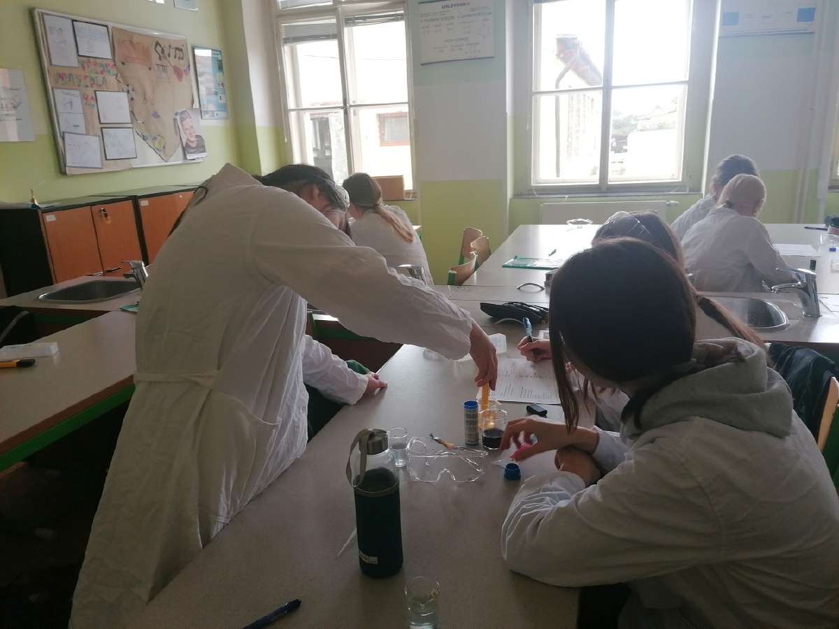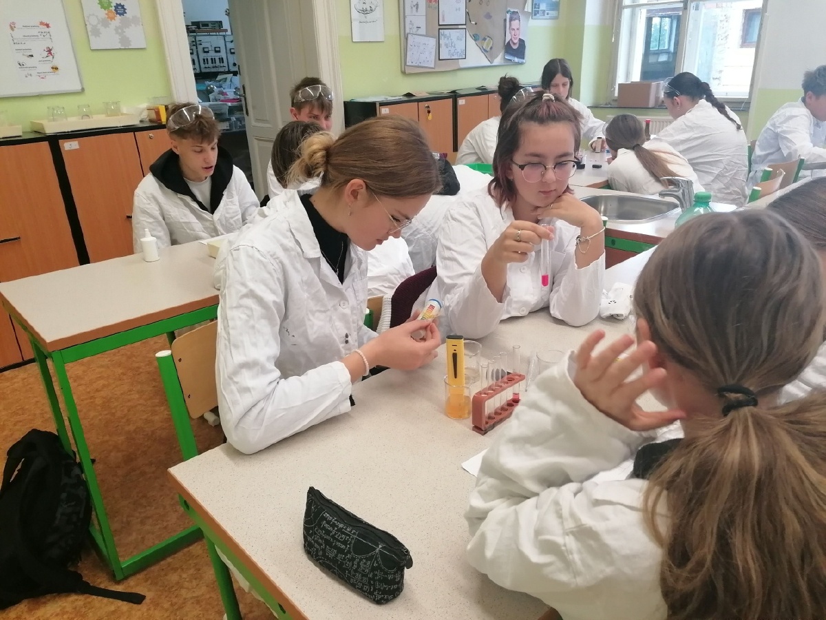 Deváťáci z A a B si během hodiny chemie procvičili určování pH různých kapalných roztoků. Nejprve použili univerzální indikátorový papírek, který mění barvu podle hodnoty pH. Dále si vyzkoušeli práci s přírodním indikátorem – odvarem z červeného zelí, který rovněž reaguje na kyselé a zásadité prostředí změnou barvy. Pro přesné určení pH poté použili pH metr. Porovnáním výsledků z jednotlivých metod mohli pozorovat rozdíly v přesnosti měření a lépe pochopit vlastnosti kyselin a zásad. Práce je nejen bavila, ale také jim přinesla cenné zkušenosti z praktické chemie. Mgr. Hana Ratajíková