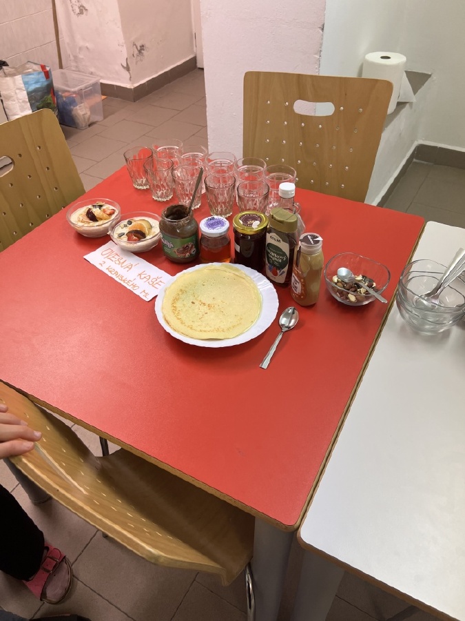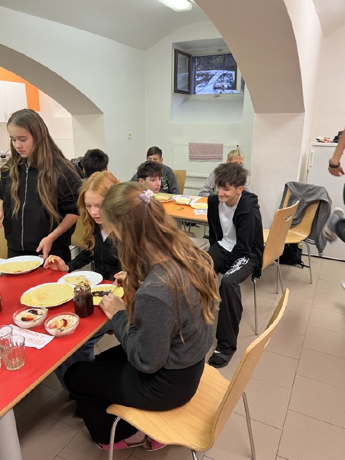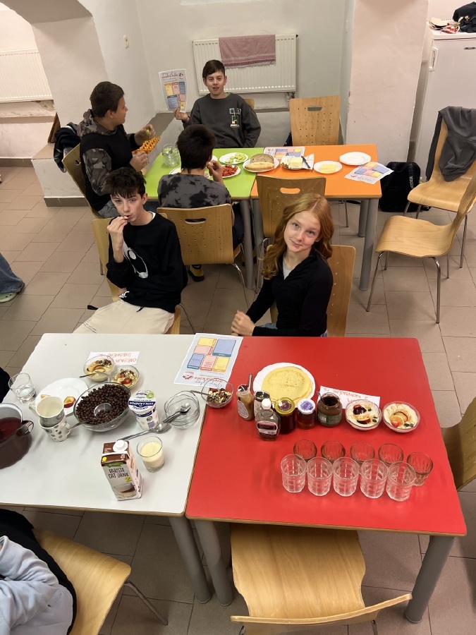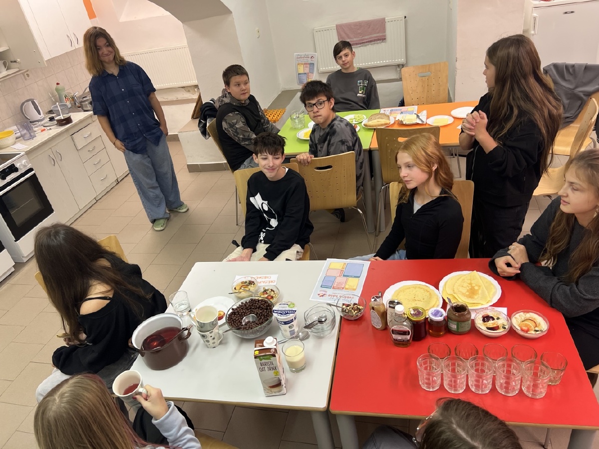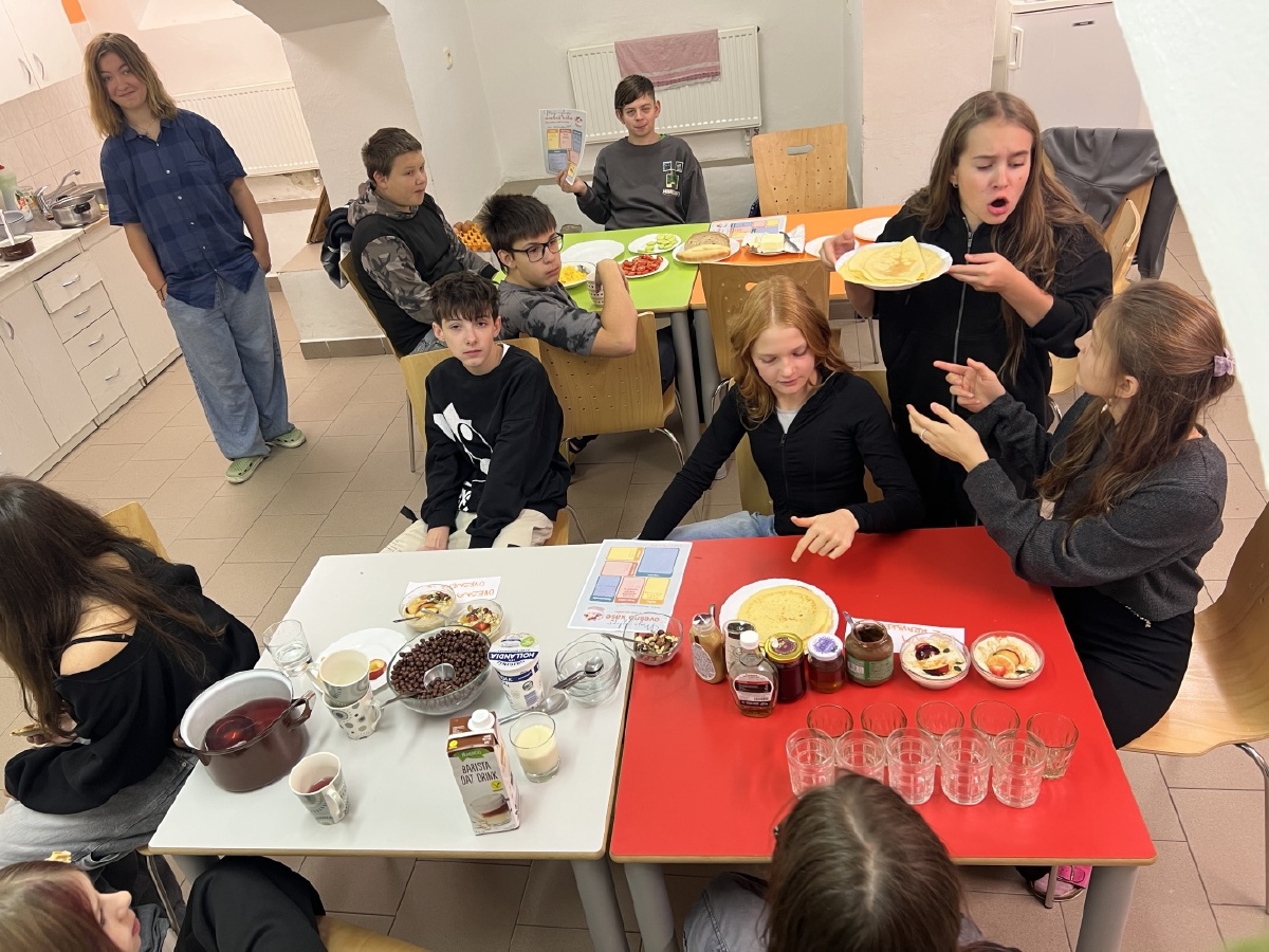 V rámci druhého setkání našeho snídaňového klubu jsme si společně připravili oblíbenou snídaňovou kaši ve dvou verzích – z kravského a z ovesného mléka. Skupiny, které měly kaši na starosti, ji krásně dozdobily ovocem, oříšky a netradičními sladidly, například čekankovým sirupem nebo medem. Další skupiny připravovaly míchaná vajíčka, sendviče a palačinky, zatímco ostatní krájeli zeleninu a ovoce a pomáhali chystat celý snídaňový bufet. Nešlo však jen o vaření – před samotnou přípravou žáci pracovali ve skupinách, počítali energetickou hodnotu surovin, převáděli kalorie na kilojouly a diskutovali o tom, které potraviny jsou udržitelnější. Velká pochvala patří celé třídě, které se podařilo vše připravit i uklidit během jediné vyučovací hodiny! Dopoledne se neslo ve znamení spolupráce, dobré nálady a zdravého jídla, které si všichni po zásluze vychutnali. Den zdravěji! Ing. Šárka Nováková