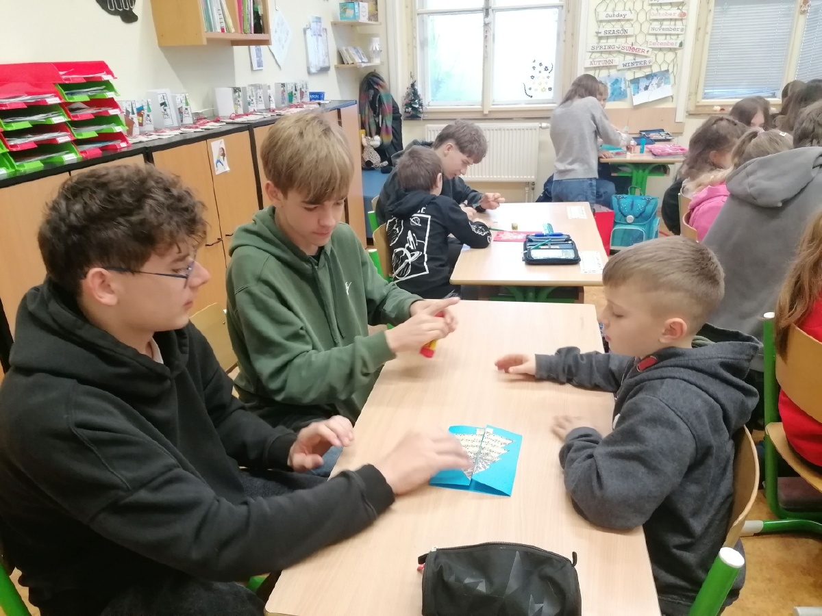 V předvánočním čase proběhlo milé setkání žáků VIII. C s jejich druháčky. Společně si užili poklidnou hodinu plnou vánoční nálady, během které byl prostor na povídání i společné tvoření. Děti vyrobily vánoční přáníčka určená rodičům a vzájemně si zpříjemnily adventní čas. Všichni se již nyní těší na další setkání, které se uskuteční už v novém kalendářním roce. Mgr. Hana Ratajíková