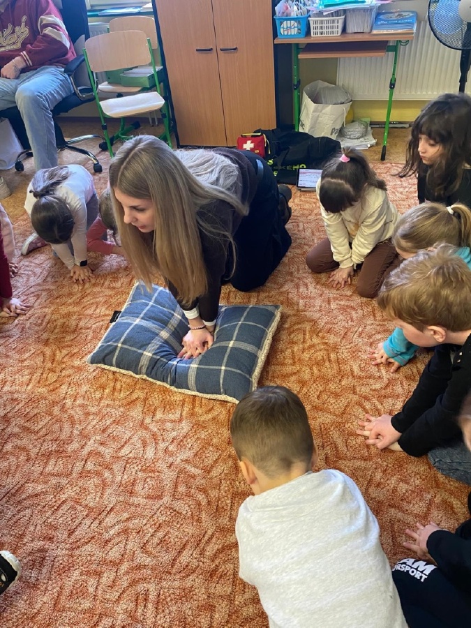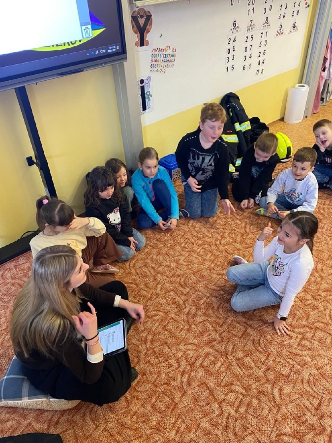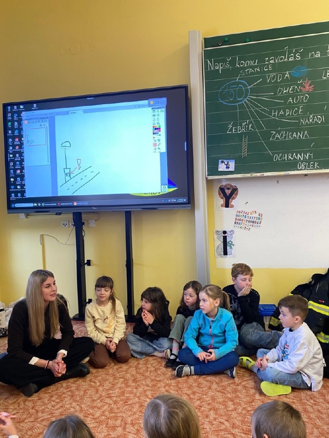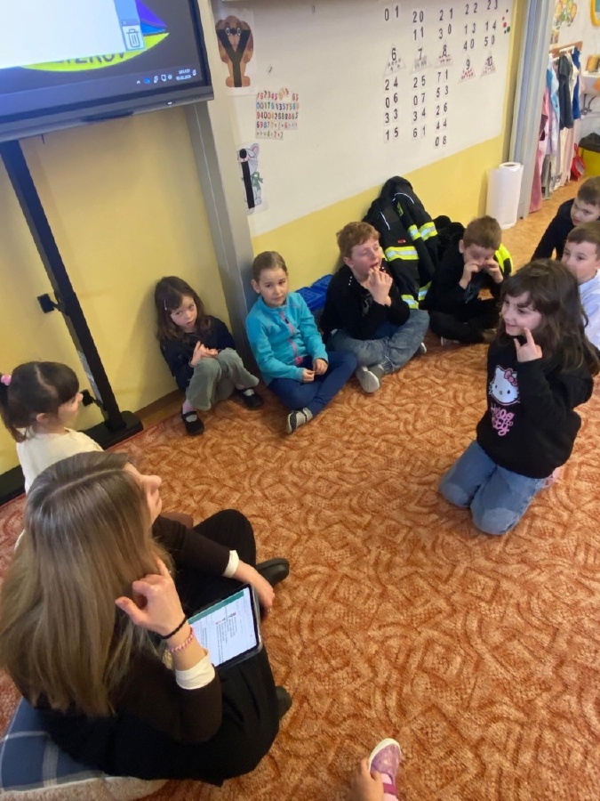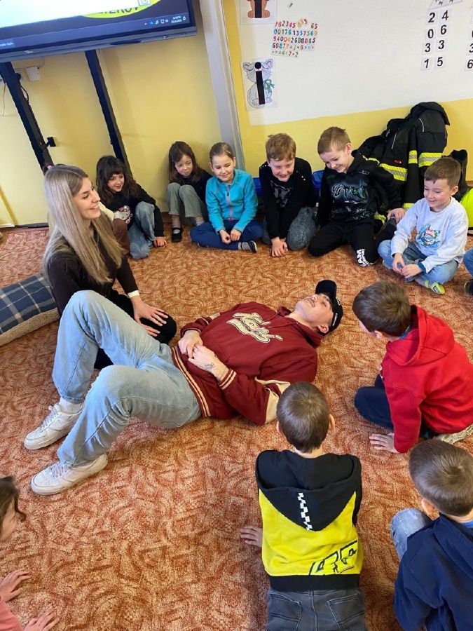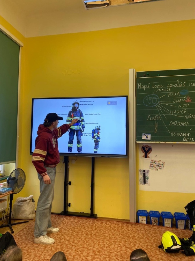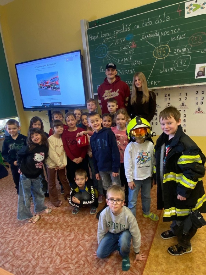 V úterý 3. února měli prvňáčci v déčku milou návštěvu. Své profese jim přišli představit Nela Patková a Vojta Men. Vojta vyprávěl poutavě o své práci hasiče, která obnáší záchranu v různých situacích, při nehodách, požárech, záchraně zvířat a majetku. Děti si mohly vyzkoušet část hasičské výstroje. Společně diskutovali o celkové výstroji, hasičských autech, důležité spolupráci a rychlé pomoci. Na konci mohli zhlédnout krátká videa, která obsahovala výjezdy hasičů a ukázky hasičského sportu. Druhá část přednášky byla věnována práci záchranářů. Děti se od Nely dozvěděly, kdo jsou záchranáři a kdy je potřeba jim zavolat. Každý dobrovolník si mohl vyzkoušet telefonický rozhovor s operátorem tísňové linky. Další zajímavou částí bylo praktické cvičení, kdy se děti učily, jak poznat, zda je člověk při vědomí a vyzkoušely si srdeční masáž. Vše probíhalo hravou a srozumitelnou formou. Přednáška byla pro děti velmi přínosná. Dozvěděly se mnoho nových informací, ale také si uvědomily, jak je důležité pomáhat druhým a nebát se zavolat pomoc v nouzi. Mgr. Štěpánka Menová