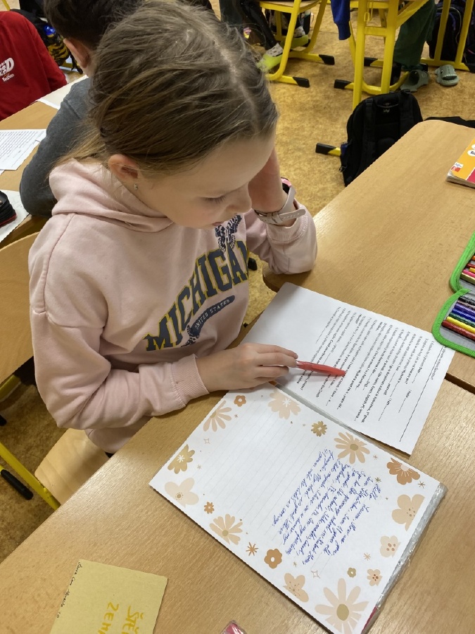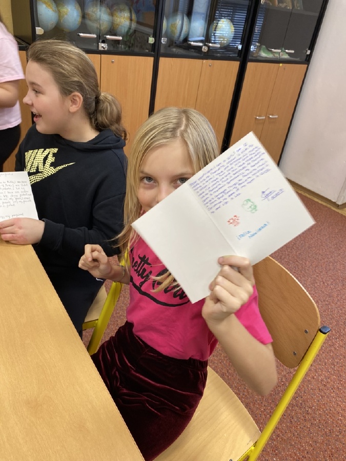 Před vánočními svátky jsme započali spolupráci se španělskou školou ve Els Pallaresos v Catalonii - dopisujeme si. A to žádné e-maily ani esemesky, ale rukou psané dopisy posílané poštou. Na naše vánoční přání, která napsaly děti z V. B a V. D, jsme v lednu dostali odpovědi. A protože už toho páťáci uměli v lednu zase o něco více z angličtiny, i jejich další dopisy byly trochu obsáhlejší. Procvičili jsme tím nejen aktuálně probíraná témata, ve kterých děti vylepšují svou schopnost vyjádřit se v anglických větách o sobě, své rodině, svých preferencích a zálibách, ale i vhodný obsah a části dopisu. S dopomocí to zvládli všichni! Je jiné učit se při školní výuce a poté být zodpovědný za to, co anglicky napíšu pro někoho ve Španělsku tak, aby mi porozuměl a pochopil mé myšlenky. A právě to zažívaly děti při projektu v dopisování. Takže se vylepšují i ve své schopnosti písemné komunikace a čitelného psaní. A kdy jste dostali naposledy dopis Vy? Že je to moc milé potěšení, by vám páťáci už mohli vyprávět... Mgr. Alena Tyrkasová, Mgr. Nikola Lukešová, Mgr. Kristýna Hurychová
