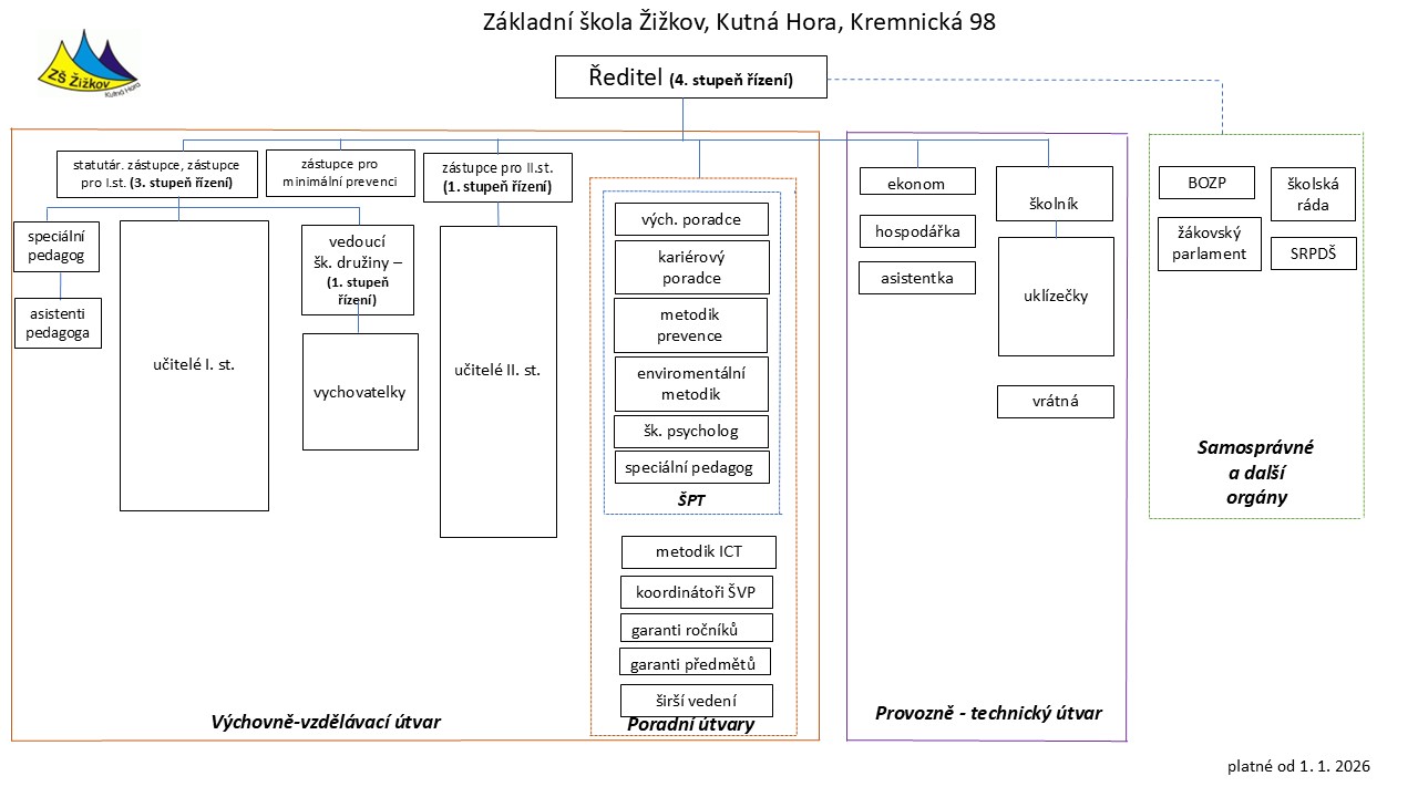 Zřizovatelem Základní školy Žižkov, Kremnická 98, Kutná Hora, příspěvkové organizace je Město Kutná Hora, Havlíčkovo nám. 552, Kutná Hora, zřizovací listina byla vydána 17.5.2019. Hlavním účelem a předmětem činnosti příspěvkové organizace je zajištění činnosti v působnosti zřizovatele v oblasti školství, zejména zabezpečení základního vzdělání, výuky a výchovy žáků. Činnost školy se řídí zákonem č.561/2004 Sb., o předškolním, základním, středním, vyšším odborném a jiném vzdělávání (školský zákon) ve znění pozdějších předpisů.