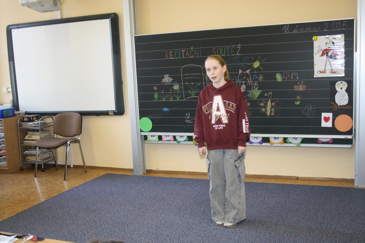 V pondělí 17. února a v úterý 18. února proběhlo školní kolo recitační soutěže. Všichni recitátoři byli výborně připravení, porota vyslechla řadu krásných básní, nadšená byla rovněž z úryvků prózy. Rozhodování o pořadí bylo prý opravdu složité. Jako vždy - soutěžící na prvních dvou místech v každé kategorii postupují do oblastního kola do Tylova divadla. K postupu jim gratulujeme a přejeme hodně úspěchů!