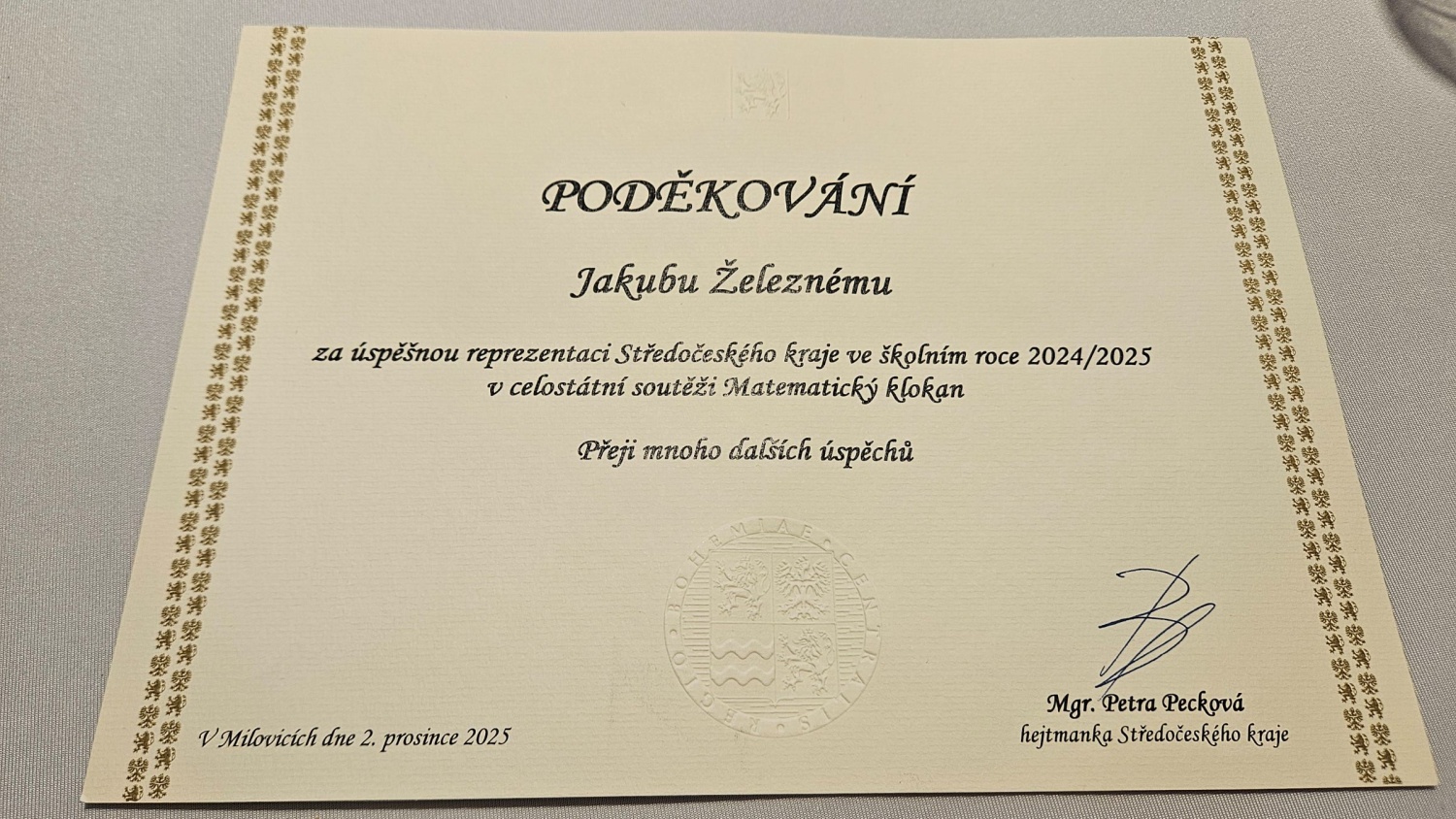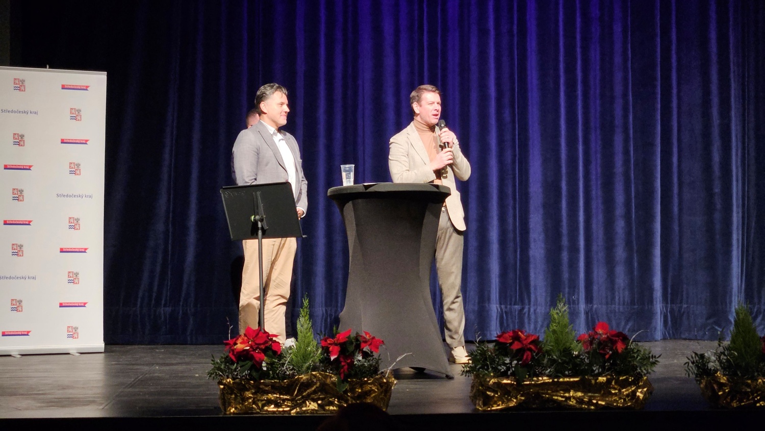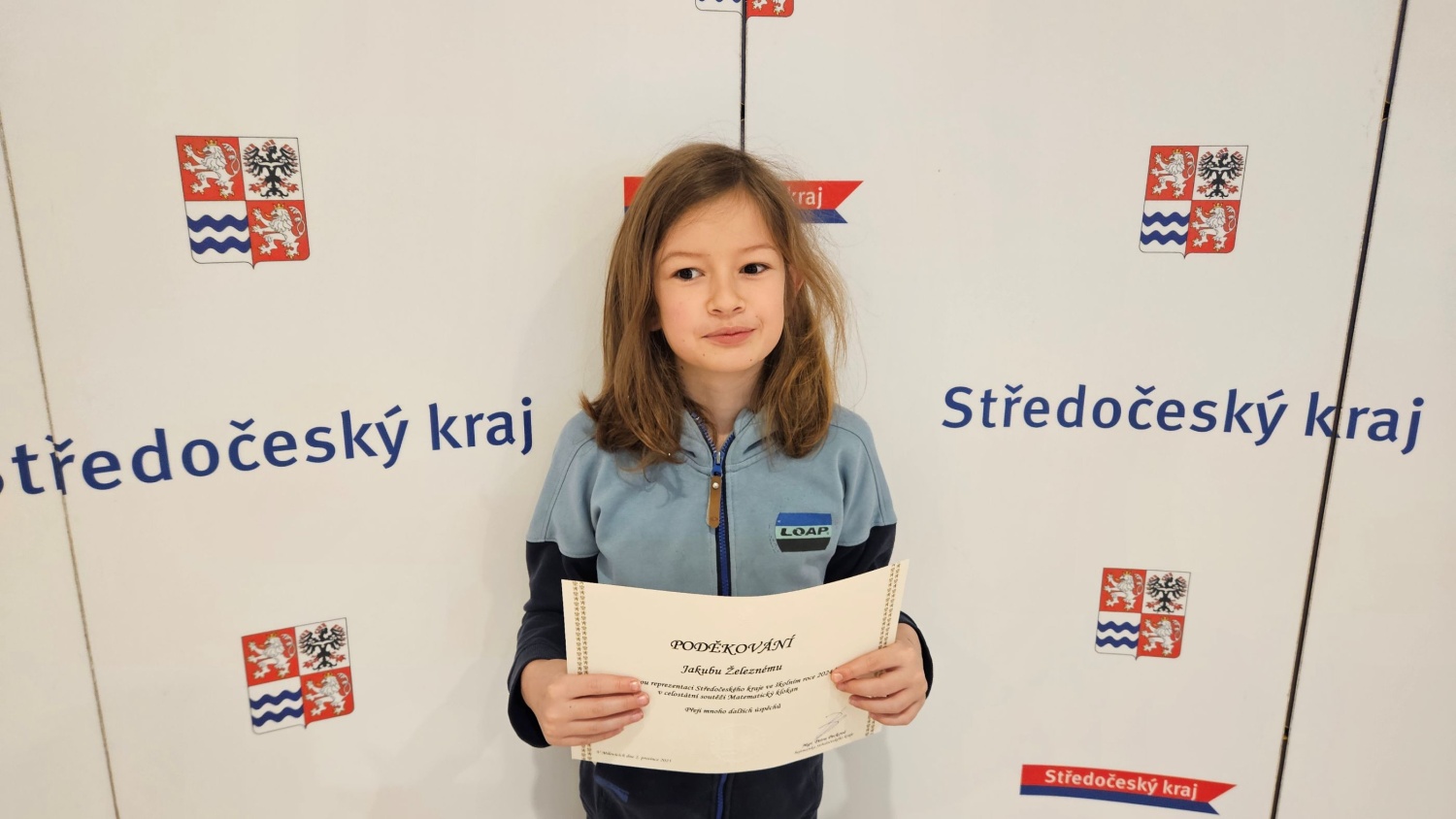Velikou radost nám i dětem přineslo pozvání na Slavnostní setkání a ocenění žáků za úspěšnou reprezentaci Středočeského kraje ve školních soutěžích ve školním roce 2024/2025, které se uskutečnilo pod záštitou Mgr. Petry Peckové, hejtmanky Středočeského kraje. Konalo se v úterý 2. prosince v Kulturním domě Milovice. Toto pozvání obdrželi Adam Kobera a Jakub Železný na skvělé umístění v matematické soutěži Klokan, kategorie Cvrček. Jsme rádi, že pozvání přijali a oceňování se v doprovodu rodičů zúčastnili. Hochům blahopřejeme k tomuto ocenění a přejeme jim mnoho dalších úspěchů.