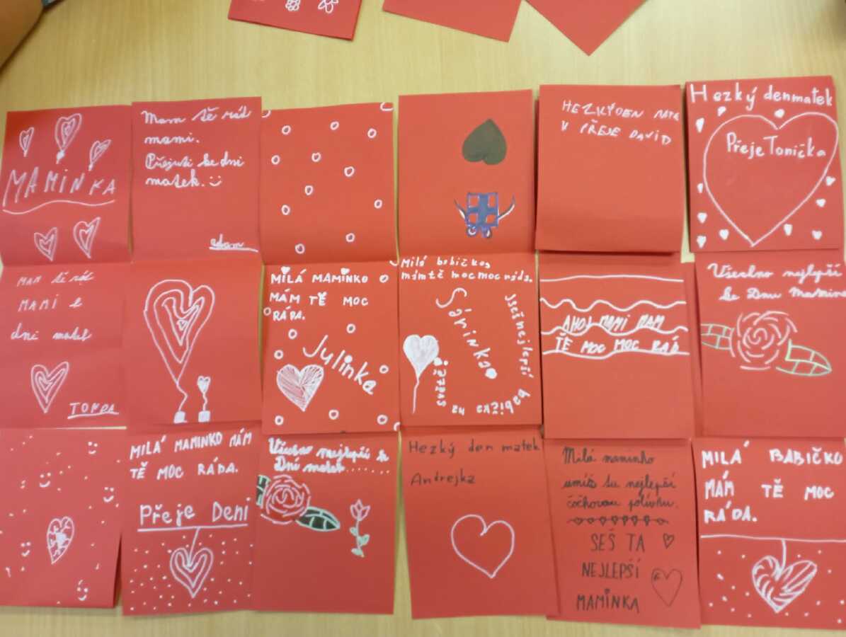 Děti ze školní družiny tento týden vyráběly s láskou přáníčka pro maminky, které v neděli oslaví svůj svátek, DEN MATEK. Chtěly jim alespoň tímto malým dárečkem poděkovat za jejich každodenní lásku, péči a starostlivost.