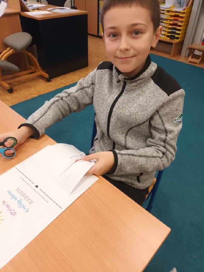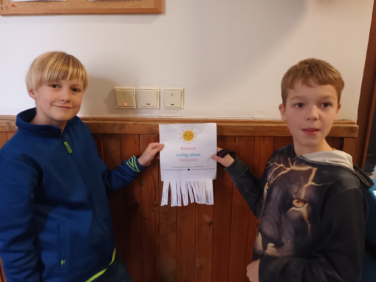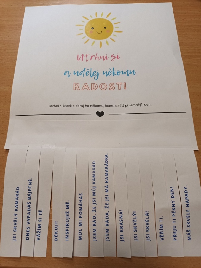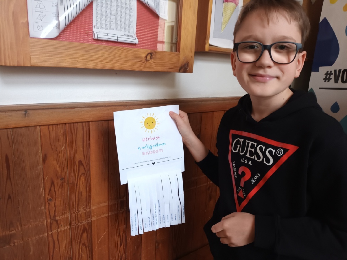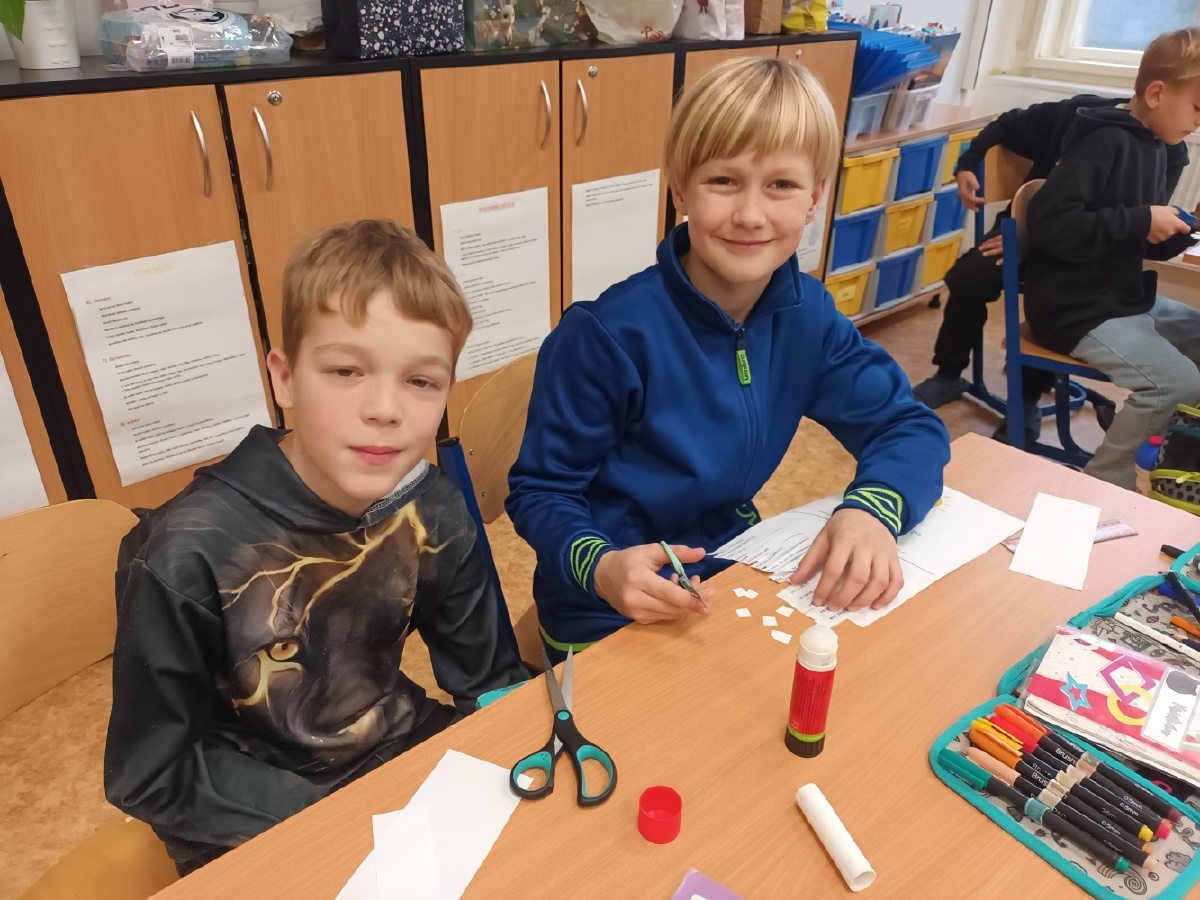 V naší škole máme speciální adventní kalendář. Na každý den připadá nějaký zajímavý a zábavný úkol. Na dnešní den, 2. prosince, připadl krásný úkol, udělat někomu radost nebo učinit dobrý skutek. Žáci ze IV. B se do tohoto zadání pustili s nadšením. V hodině výtvarné výchovy vytvořili originální papíry s odtrhávacími lístečky. Na nich byly milé a povzbudivé vzkazy jako například: „Jsi skvělý kamarád.“ „Moc mi pomáháš.“ nebo „Přeju ti pěkný den!“ Hotové listy žáci rozmístili po celé škole, aby si každý, kdo bude chtít potěšit druhého, mohl jeden lísteček utrhnout a předat dál. A zájem byl velký – už během téhož odpoledne byly některé papíry úplně bez lístečků. Věříme, že se díky nim rozšířilo po škole mnoho úsměvů a příjemných okamžiků. A čtvrťáci? Ti si své přání udělat ostatním radost rozhodně splnili. Mgr. Markéta Štifterová