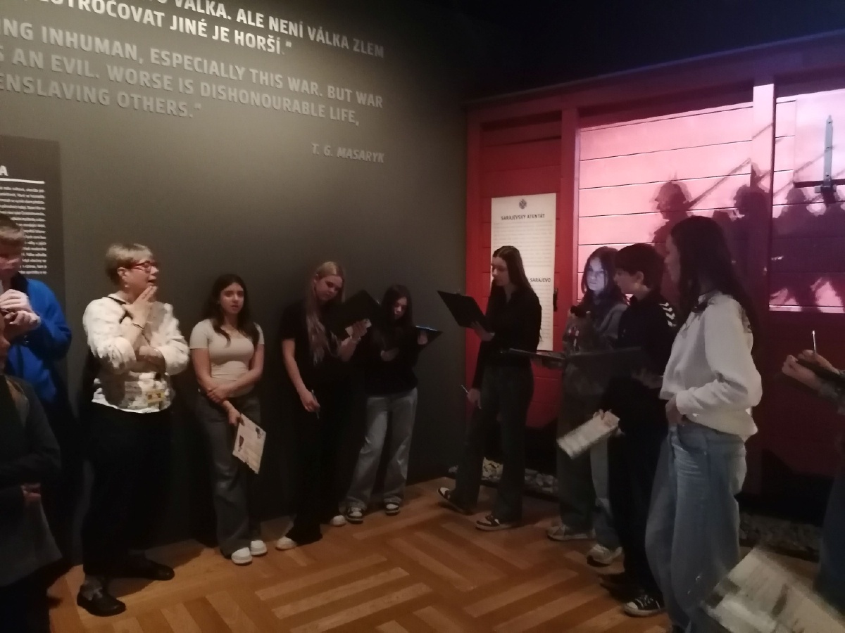 Ve čtvrtek 23. dubna navštívili žáci VIII. C Armádní muzeum v Praze. Na 5000m2, čtyřech patrech expozic, mapujících vývoj od středověku až po současnost, mohli osmáci vidět stovky autentických artefaktů, od uniforem rakousko-uherské armády, přes zbraně, až po osobní předměty vojáků, které doplňovaly jejich příběhy. Součástí exkurze byl i připravený výukový program s názvem Příběh Velké války. Jednotlivé týmy plnily úkoly v různých sálech a mohly tak zažít interaktivní prohlídku, například průchod zákopy, což byl pro všechny veliký zážitek. Osmáci si vyzkoušeli i práci badatele a své výsledky pak zprostředkovali ostatním spolužákům. Propojili tak školní učivo s reálnými historickými artefakty a detailněji se ponořili do vojenství a politiky historie let 1914- 1918. Z práce osmáků jsme měli radost, pochvalu si vysloužili i od lektorky. Mgr. Jana Samková, Mgr. Hana Ratajíková