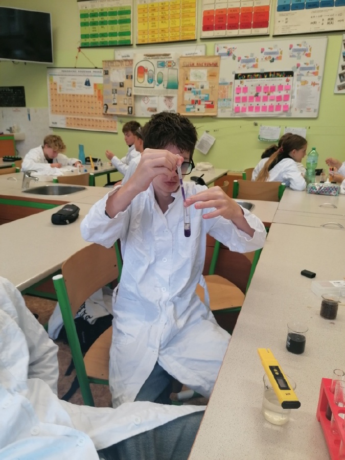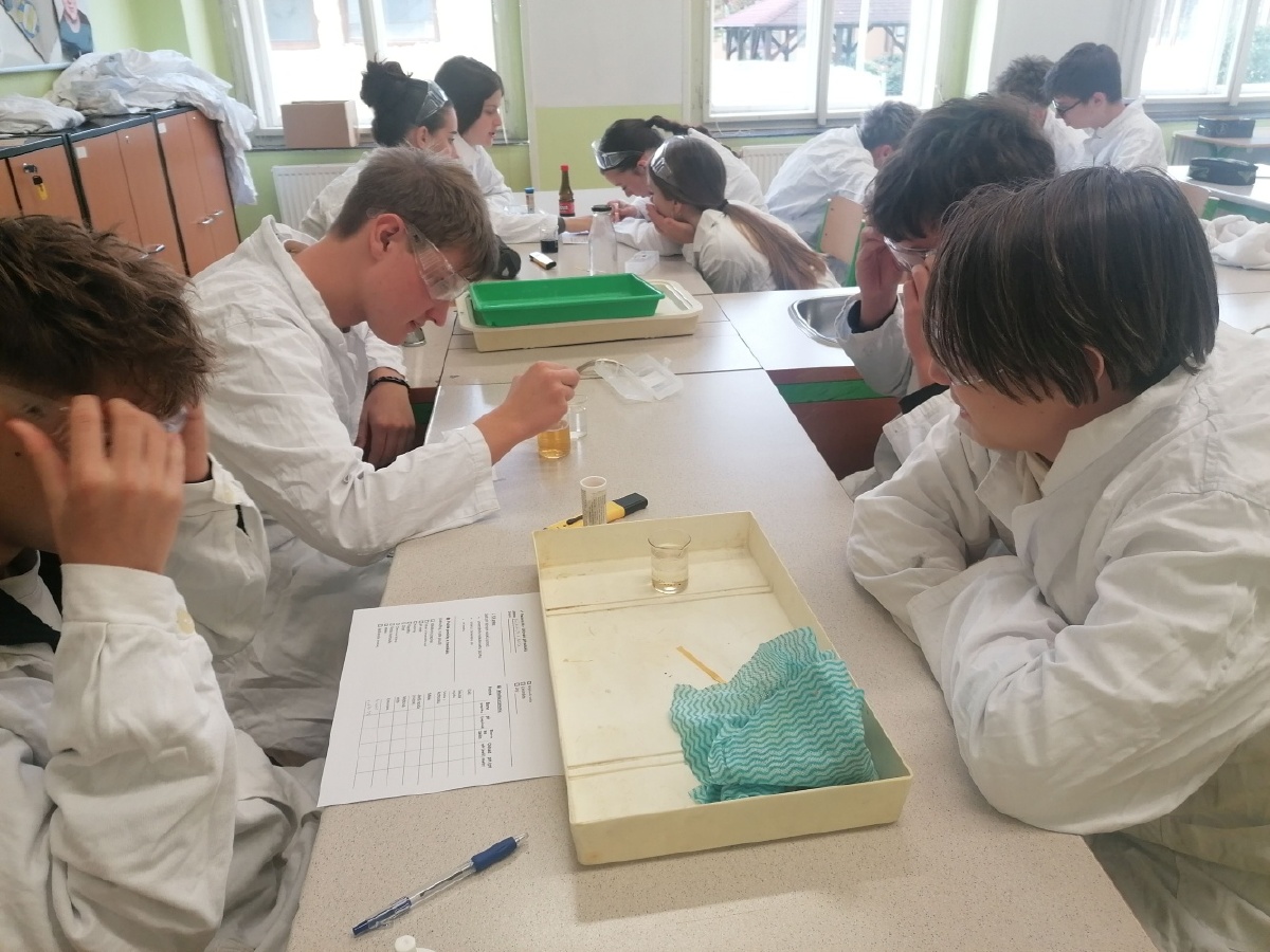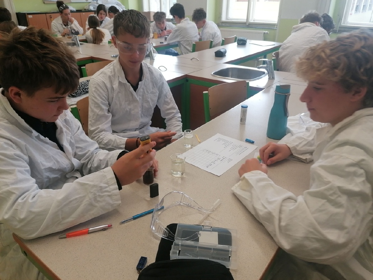 Deváťáci z A a B si během hodiny chemie procvičili určování pH různých kapalných roztoků. Nejprve použili univerzální indikátorový papírek, který mění barvu podle hodnoty pH. Dále si vyzkoušeli práci s přírodním indikátorem – odvarem z červeného zelí, který rovněž reaguje na kyselé a zásadité prostředí změnou barvy. Pro přesné určení pH poté použili pH metr. Porovnáním výsledků z jednotlivých metod mohli pozorovat rozdíly v přesnosti měření a lépe pochopit vlastnosti kyselin a zásad. Práce je nejen bavila, ale také jim přinesla cenné zkušenosti z praktické chemie. Mgr. Hana Ratajíková