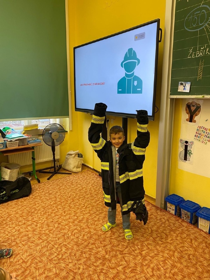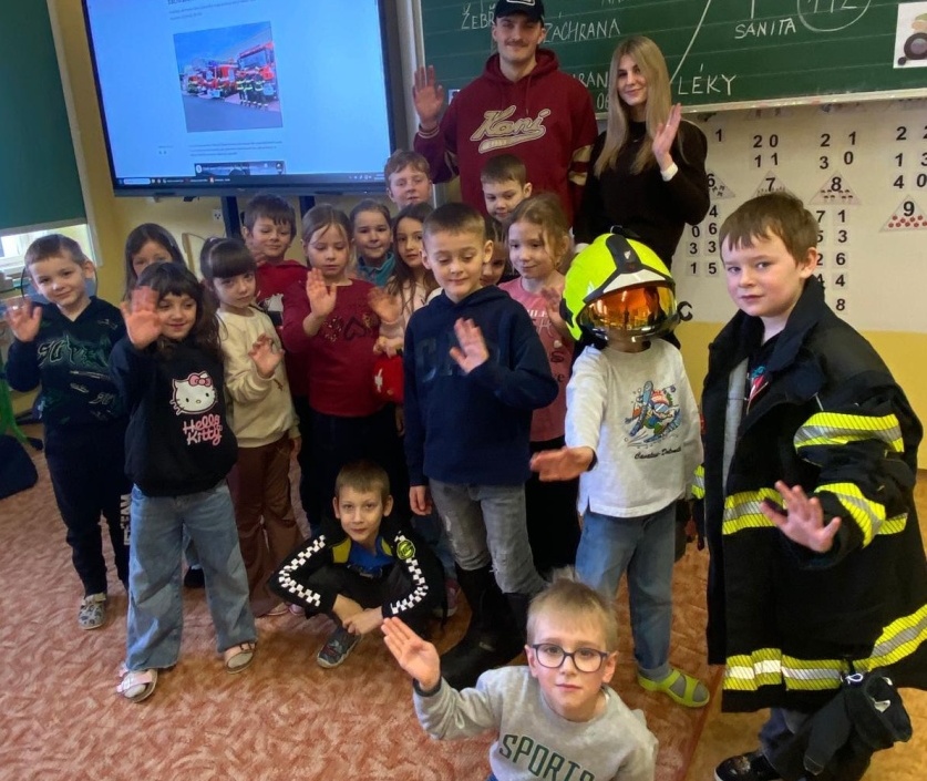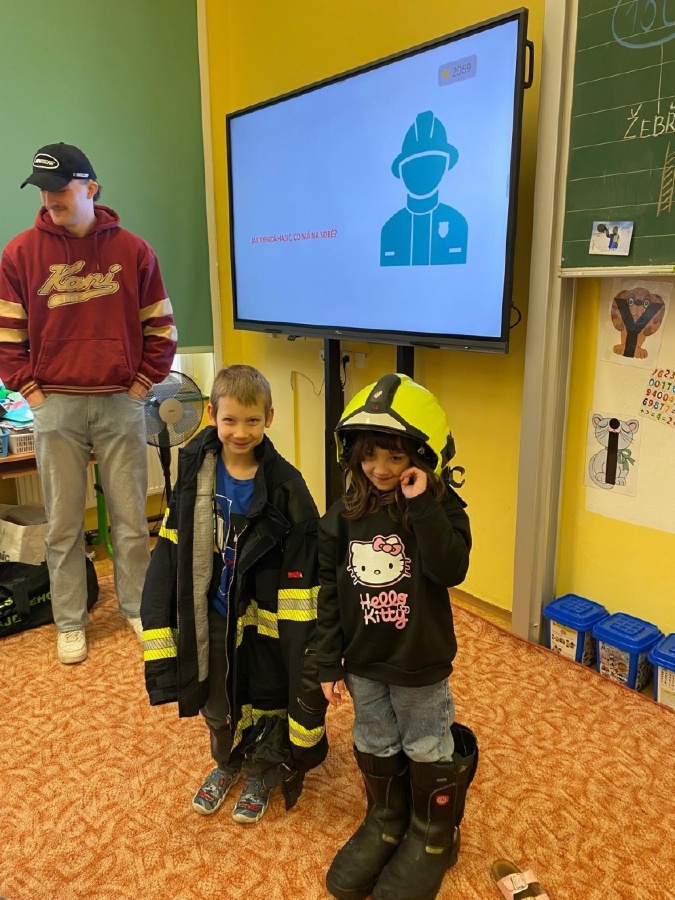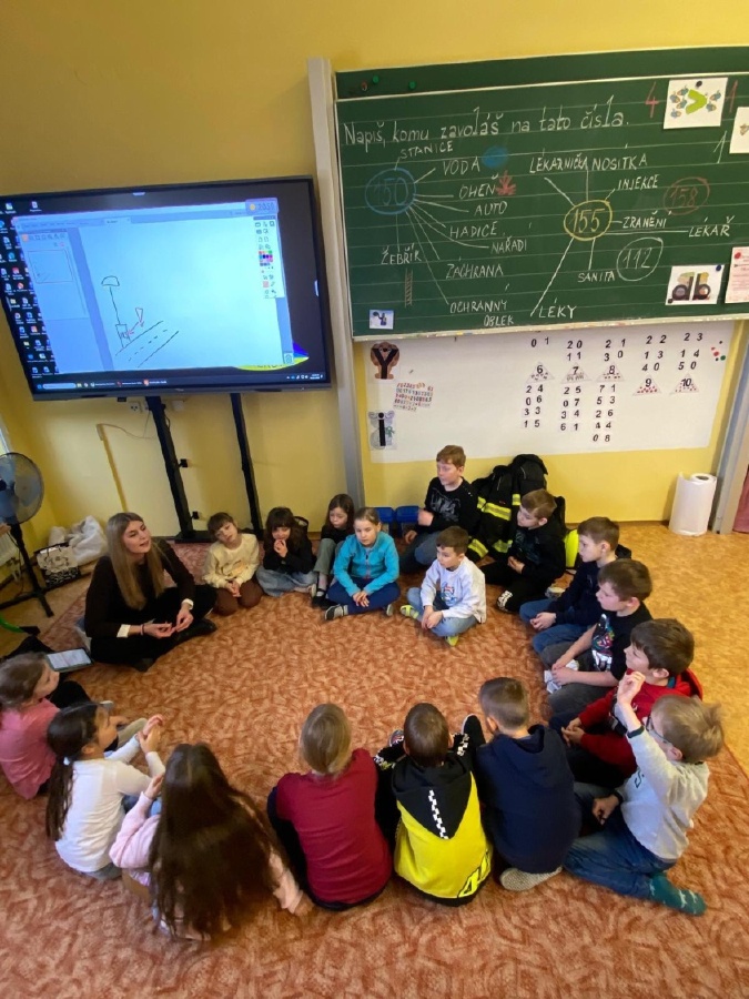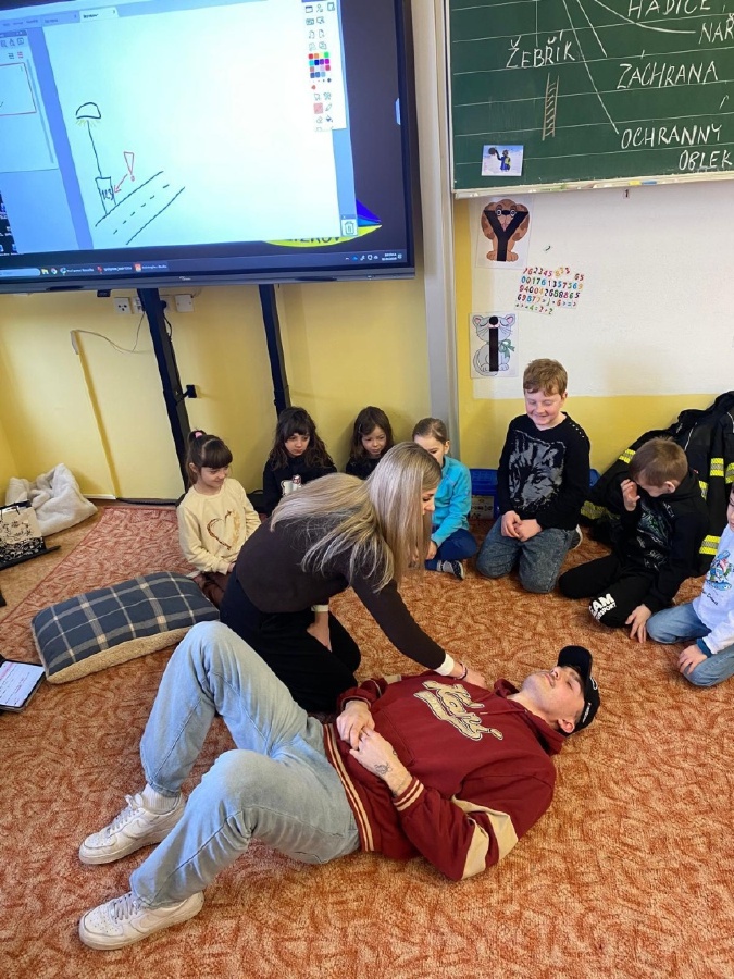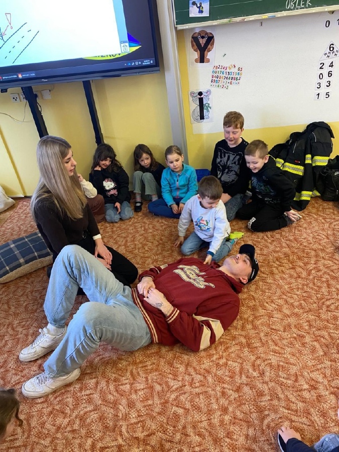 V úterý 3. února měli prvňáčci v déčku milou návštěvu. Své profese jim přišli představit Nela Patková a Vojta Men. Vojta vyprávěl poutavě o své práci hasiče, která obnáší záchranu v různých situacích, při nehodách, požárech, záchraně zvířat a majetku. Děti si mohly vyzkoušet část hasičské výstroje. Společně diskutovali o celkové výstroji, hasičských autech, důležité spolupráci a rychlé pomoci. Na konci mohli zhlédnout krátká videa, která obsahovala výjezdy hasičů a ukázky hasičského sportu. Druhá část přednášky byla věnována práci záchranářů. Děti se od Nely dozvěděly, kdo jsou záchranáři a kdy je potřeba jim zavolat. Každý dobrovolník si mohl vyzkoušet telefonický rozhovor s operátorem tísňové linky. Další zajímavou částí bylo praktické cvičení, kdy se děti učily, jak poznat, zda je člověk při vědomí a vyzkoušely si srdeční masáž. Vše probíhalo hravou a srozumitelnou formou. Přednáška byla pro děti velmi přínosná. Dozvěděly se mnoho nových informací, ale také si uvědomily, jak je důležité pomáhat druhým a nebát se zavolat pomoc v nouzi. Mgr. Štěpánka Menová