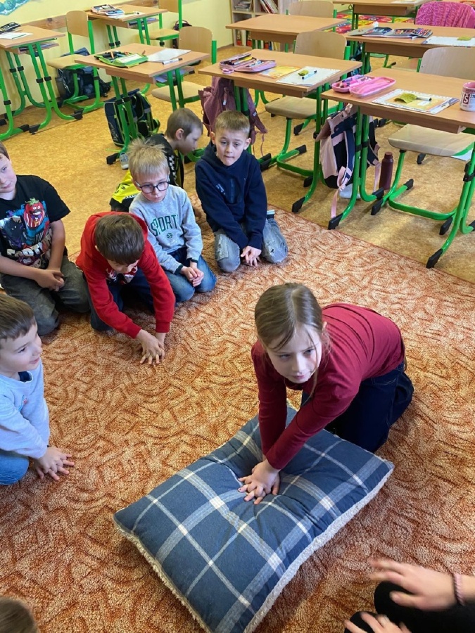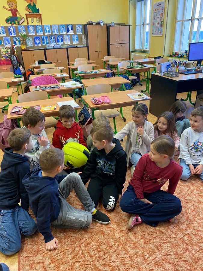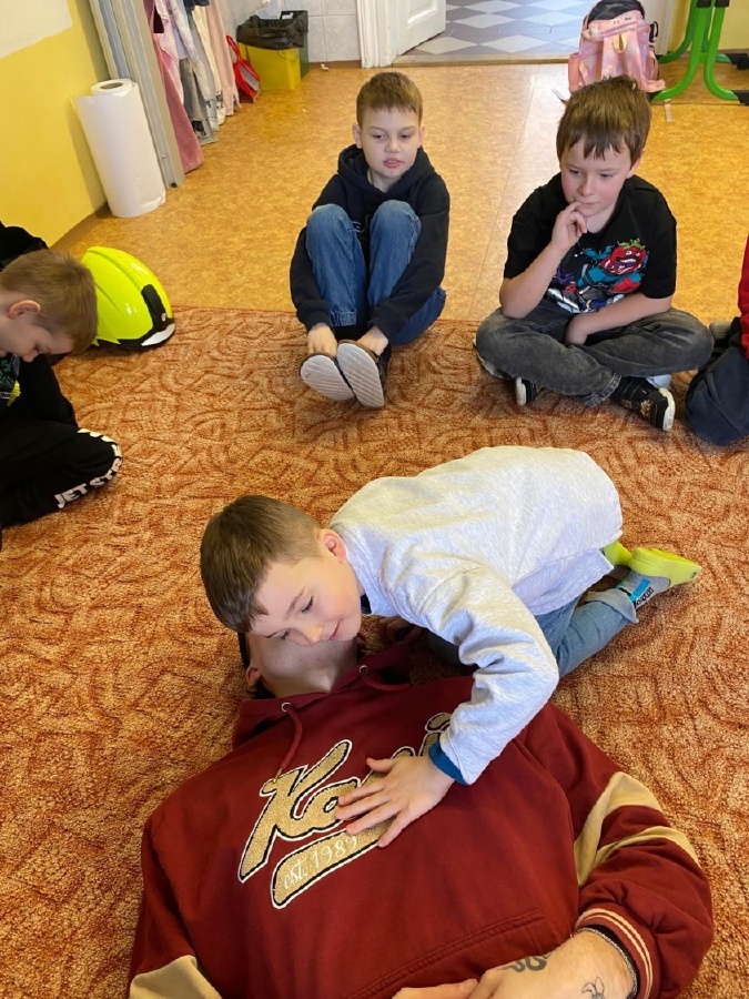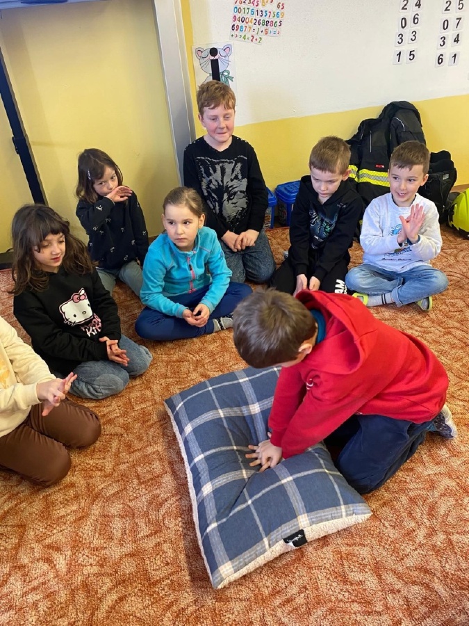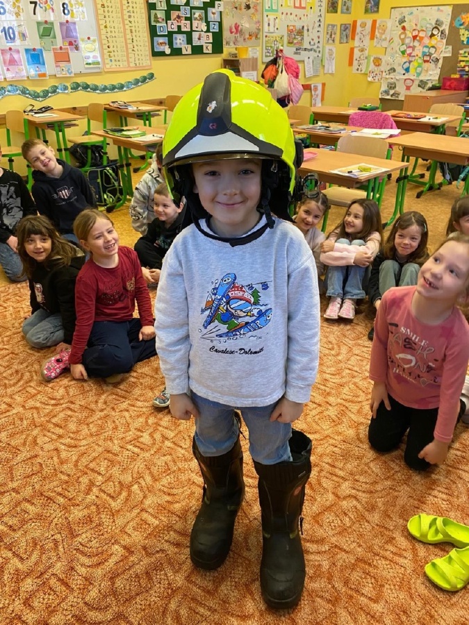 V úterý 3. února měli prvňáčci v déčku milou návštěvu. Své profese jim přišli představit Nela Patková a Vojta Men. Vojta vyprávěl poutavě o své práci hasiče, která obnáší záchranu v různých situacích, při nehodách, požárech, záchraně zvířat a majetku. Děti si mohly vyzkoušet část hasičské výstroje. Společně diskutovali o celkové výstroji, hasičských autech, důležité spolupráci a rychlé pomoci. Na konci mohli zhlédnout krátká videa, která obsahovala výjezdy hasičů a ukázky hasičského sportu. Druhá část přednášky byla věnována práci záchranářů. Děti se od Nely dozvěděly, kdo jsou záchranáři a kdy je potřeba jim zavolat. Každý dobrovolník si mohl vyzkoušet telefonický rozhovor s operátorem tísňové linky. Další zajímavou částí bylo praktické cvičení, kdy se děti učily, jak poznat, zda je člověk při vědomí a vyzkoušely si srdeční masáž. Vše probíhalo hravou a srozumitelnou formou. Přednáška byla pro děti velmi přínosná. Dozvěděly se mnoho nových informací, ale také si uvědomily, jak je důležité pomáhat druhým a nebát se zavolat pomoc v nouzi. Mgr. Štěpánka Menová