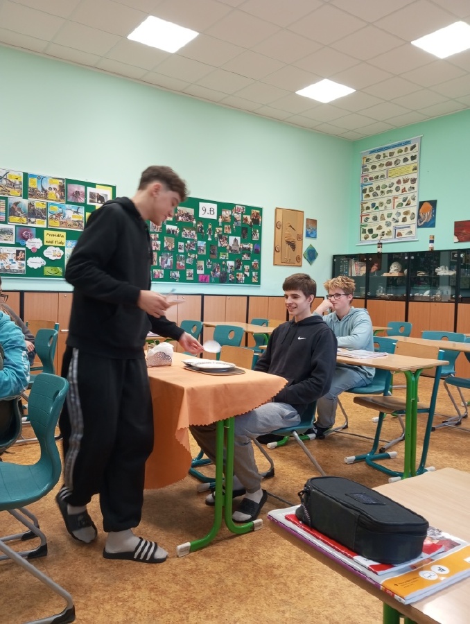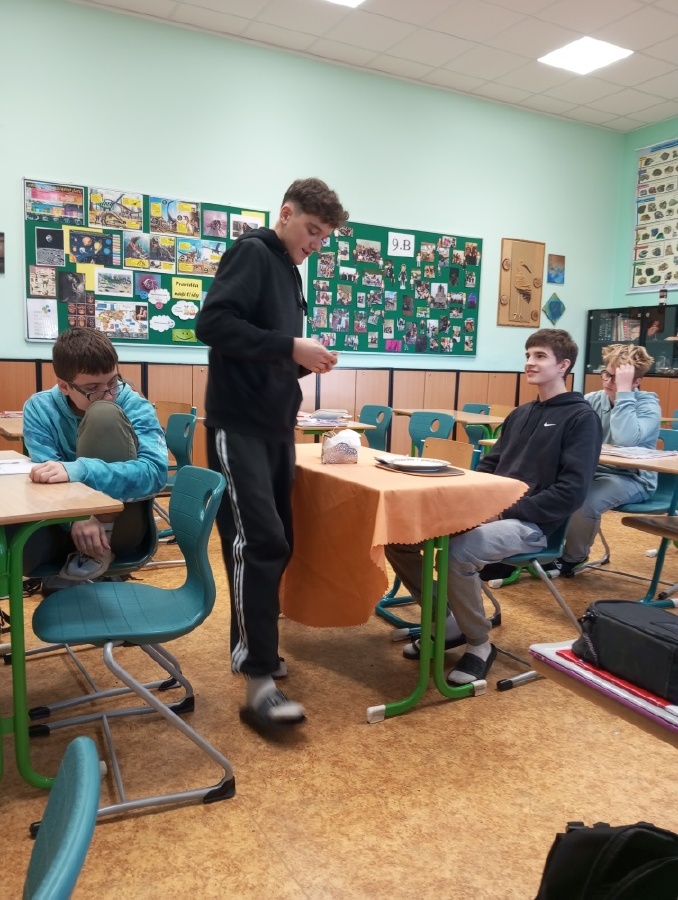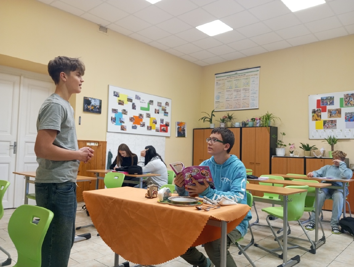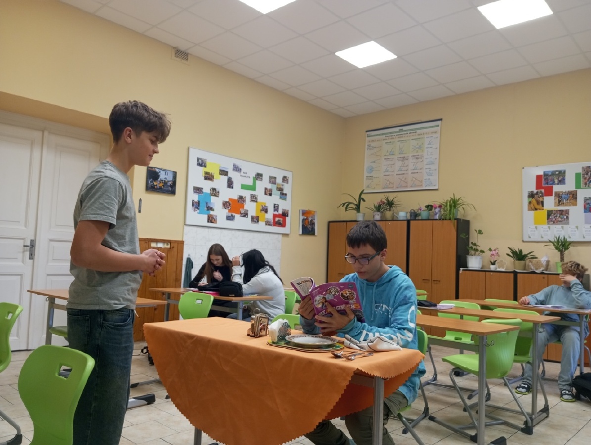 V rámci inovativního přístupu k výuce angličtiny, inspirovaného návštěvou holandské školy v rámci projektu Erasmus+ (job-shadowing), si žáci všech 9. tříd vyzkoušeli dlouhodobý projekt „Food and Catering“, který propojuje teoretické znalosti s praktickými dovednostmi. Prvním výstupem projektu byl reálný dialog v restauraci, předvedený v anglickém jazyce, kde si studenti vyzkoušeli role zákazníka a číšníka. Před nácvikem dialogu probíhala cílená příprava – opakování a procvičování slovní zásoby a frází prostřednictvím cvičení, poslechů nebo videí. Dialog sloužil jako praktický test jazykových dovedností – žáci měli možnost předvést celý proces návštěvy v restauraci, od přivítání a uvedení ke stolu, přes objednání jídla a pití, až po závěrečné placení. Tím ukázali, jak by se dokázali orientovat a komunikovat v reálné situaci v zahraniční restauraci a vyzkoušeli si autentickou konverzací. Ve fotogalerii z hodin můžete vidět, že si celý projekt studenti opravdu užívali. Mgr. Hana Votavová