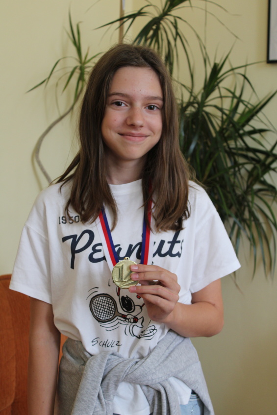 Terezka Dušková z V. A je výborná atletka. Tomuto sportu se věnuje už od 2. třídy. Trénuje v Kutné Hoře, jak nám svěřila, tento rok má tréninky třikrát týdně. Její nejoblíbenější disciplínou je skok do dálky. Jsme rádi, že se s námi podělila o své úspěchy, na fotografii ji zdobí medaile za štafetu. Přejeme Terezce spoustu dalších medailí a ať jí sport i nadále těší!